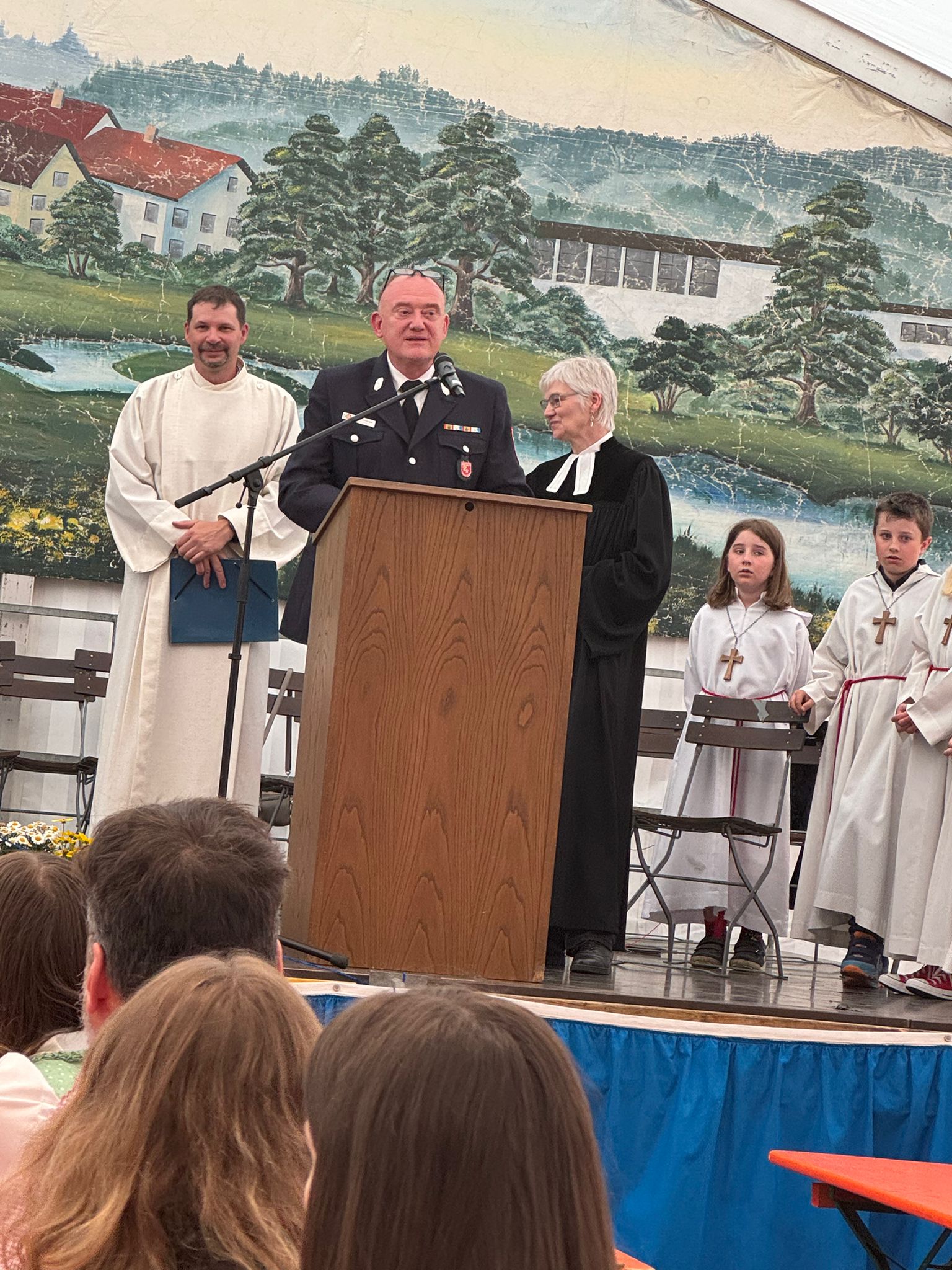 Am Volksfestsonntag konnten Pfarrerin Doris Arlt und Wortgottesdienstleiter Alexander Zaisch, mit Hilfe des Gesangsvereins und dessen Kinderchors einen sehr kurzweiligen und schönen Gottesdienst mit anschließender Segnung des neuen Feuerwehrautos vom Bund halten. Im Gottesdienst wurde die liebende Verbindung von Gott und uns und den Menschen untereinander in den Vordergrund gestellt. Nach einer Aktionsreichen Predigt und dem von den Frauen des Gesangsvereins toll vorgetragenem Lied "I will follow him" wurde das neue LF 20 KatS und dessen Besatzungen unter den Schutz Gottes gestellt.