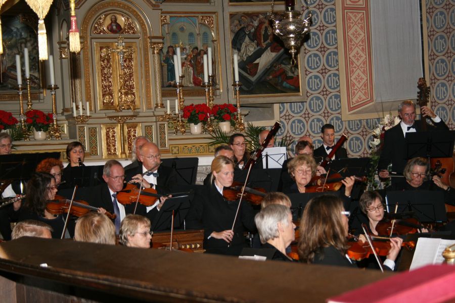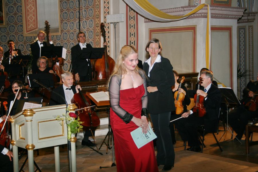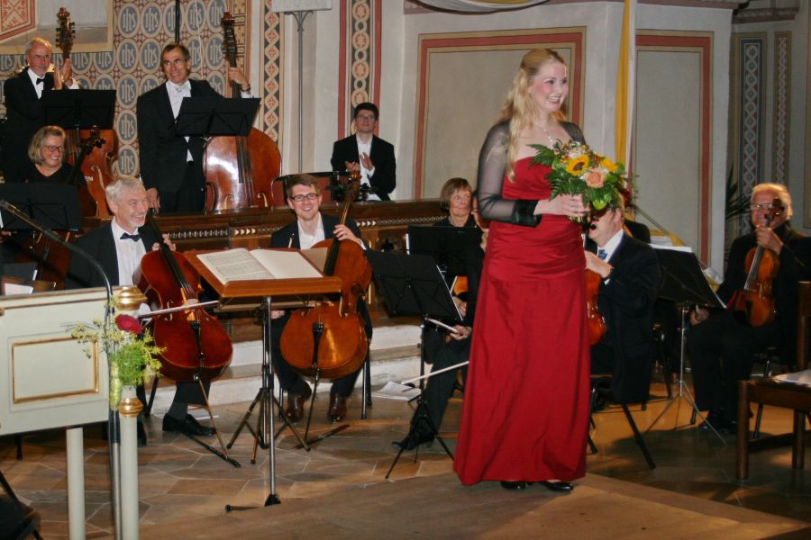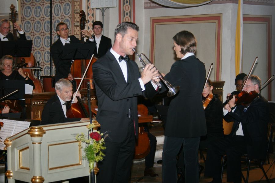 Mit der Ankündigung eines musikalischen „Hochfestes“ hatte Pater Jan Domaradzki, Pfarrer in Ilmmünster, in der Begrüßung nicht zu hoch gegriffen. Vom ersten Ton an, gelang es Musikerinnen und Musikern die Zuhörer zu fesseln und zu begeistern. Den Auftakt des Konzertabends bildete die Sinfonie Nr. 26 von Josef Haydn, ein Werk in drei Sätzen, das den Beinamen „Lamentatione“ trägt. Gabriele Winkler, die Orchestersprecherin, hatte in ihrer kurzen und launigen Konzerteinführung allerdings schon darauf hingewiesen, diese Sinfonie sei aber „nicht so jammervoll, wie es der Titel vermuten lässt“. Das Orchester überzeugte mit musikalischer Ausdruckskraft und einer gewaltigen harmonischen Klangfülle, die durch Oboe, Fagott und Horn bereichert wurde. Es folgte nun das Trompetenkonzert „in strahlendem Es-Dur“ von Johann Nepomuk Hummel. Solist was Dirk Abendroth, der bei BMW im Bereich Entwicklung Antrieb arbeitet und den die Sprecherin als Beispiel dafür ankündigte, dass „BMW nicht nur mit Autohupen Lärm machen kann“. Im Auftreten und Spiel des Solisten zeigte sich, dass er eine solide musikalische Ausbildung und Konzerterfahrung als Solist mitbringt: Mit gelassener Sicherheit entlockte er seinem Instrument strahlende, lupenreine Töne, die er mit großer Finger- und Zungenfertigkeit aneinander reihte und modellierte. War der Applaus nach dem ersten Programmpunkt aus Unsicherheit noch ausgeblieben, so gab es jetzt kein Halten mehr und das Publikum bedachte die großartige Leistung mit begeistertem Beifall. Ein weiterer solistischer Höhepunkt des Abends kündigte sich nun mit der Motette Exsultate Jubilate für Sopran und Orchester an. Solistin war Kristi Anna Isene, eine norwegische Sopranistin. Im ersten Satz wandte sie sich mit der Aufforderung ‚Exsultate, jubilate‘ – freut euch, jauchzt und jubiliert - direkt an ihre Zuhörer mit einer Nachdrücklichkeit, dass man ihr kaum widerstehen konnte. Im Gegensatz dazu interpretierte sie den 3. Satz als Gebet an die Gottesmutter, innig und nach innen gekehrt, um dann ein mitreißendes Alleluja anzustimmen. Ausgestattet mit einer begnadeten Stimme und einer differenzierten Ausdrucksweise zog sie die Zuhörer in ihren Bann – ein wahrlich glanzvoller Auftritt.