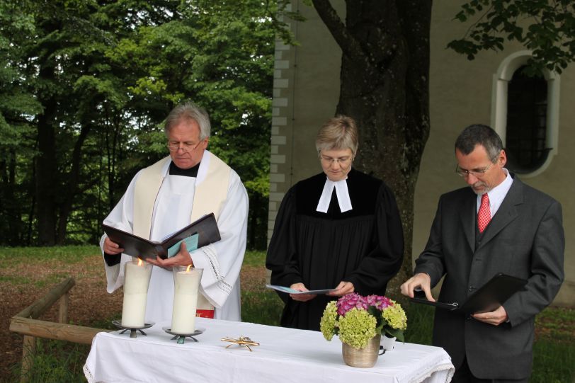 Über 100 Christen verschiedener Konfessionen feierten am Vatertag bei zwar kaltem, aber trockenem und sonnigem Wetter gemeinsam den traditionellen Ökumenischen Gottesdienst an der Wallfahrtskapelle Herrnrast, der heuer unter dem Thema „Gute Botschaften in die Welt schicken“ stand. Eingeladen hatten die katholischen Pfarrgemeinden des Pfarrverbands Ilmmünster, die Evangelisch-Lutherische Kirchengemeinde Pfaffenhofen sowie die Evangelisch-Freikirchliche Gemeinde (Baptisten) Pfaffenhofen. Der Gottesdienst, der Kinder und Erwachsene gleichermaßen ansprach, wurde von Pater Tadeusz Sobczyk, Pfarrerin Doris Arlt und Pastor Hannes Neubauer gemeinsam zelebriert und vom Posaunenchor musikalisch gestaltet. Vorbereitet hatte den Gottesdienst ein Team ehrenamtlich engagierter Christen aus Reichertshausen und Ilmmünster gemeinsam mit den Seelsorgern. Zum Abschluss des Gottesdienstes ließen die Kinder Luftballons mit den daran angehängten „guten Botschaften“ für die noch unbekannten Empfänger steigen, die sich mit dem kräftigen Westwind zügig auf die Reise Richtung Chiemsee/Salzburg machten. Vor allem die Kinder warten sicher ungeduldig darauf, dass sich der ein oder andere Empfänger der guten Wünsche und damit Finder der Ballons darüber freut und vielleicht eine ebenso gute Botschaft an die Pfaffenhofener Christen wieder zurückschickt.