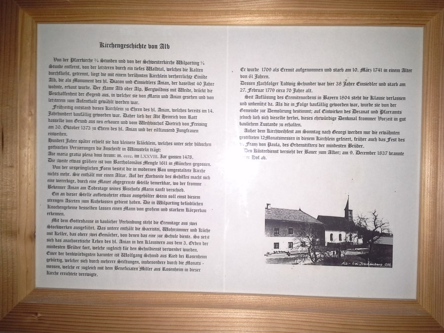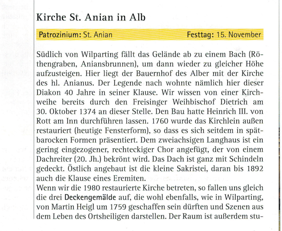 Südlich von Wilparting fällt das Gelände ab zu einem Bach (Röthengraben, Aniansbrunnen), um dann wieder zu gleicher Höhe aufzusteigen. Hier liegt der Bauernhof des Alber mit der Kirche des hl. Anianus. Der Legende nach wohnte nämlich hier dieser Diakon 40 Jahre in seiner Klause.