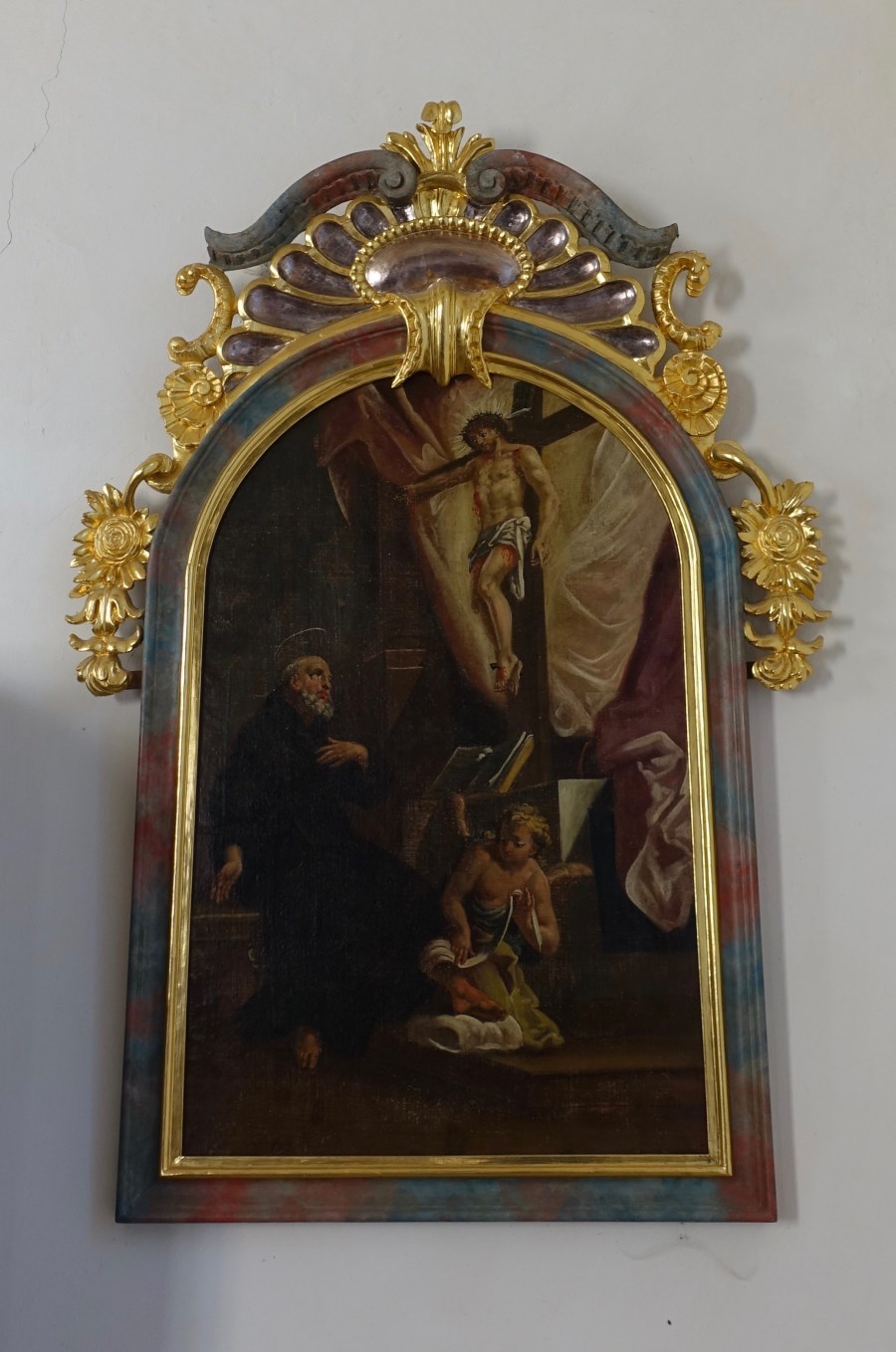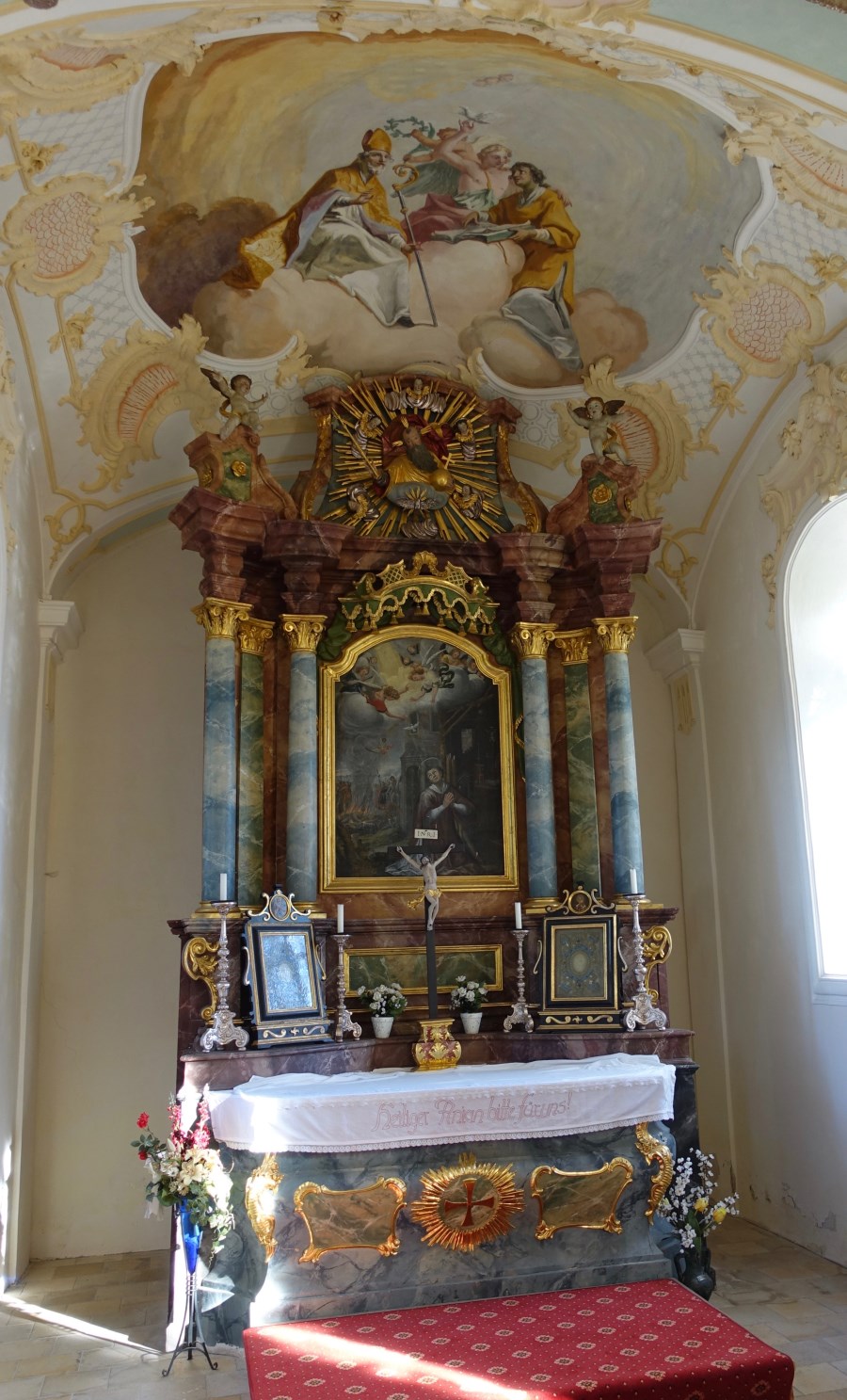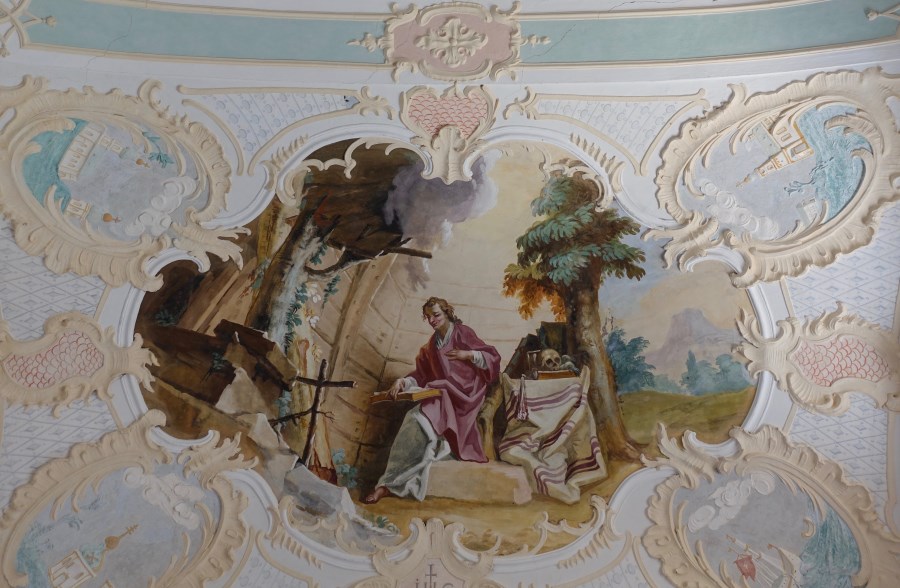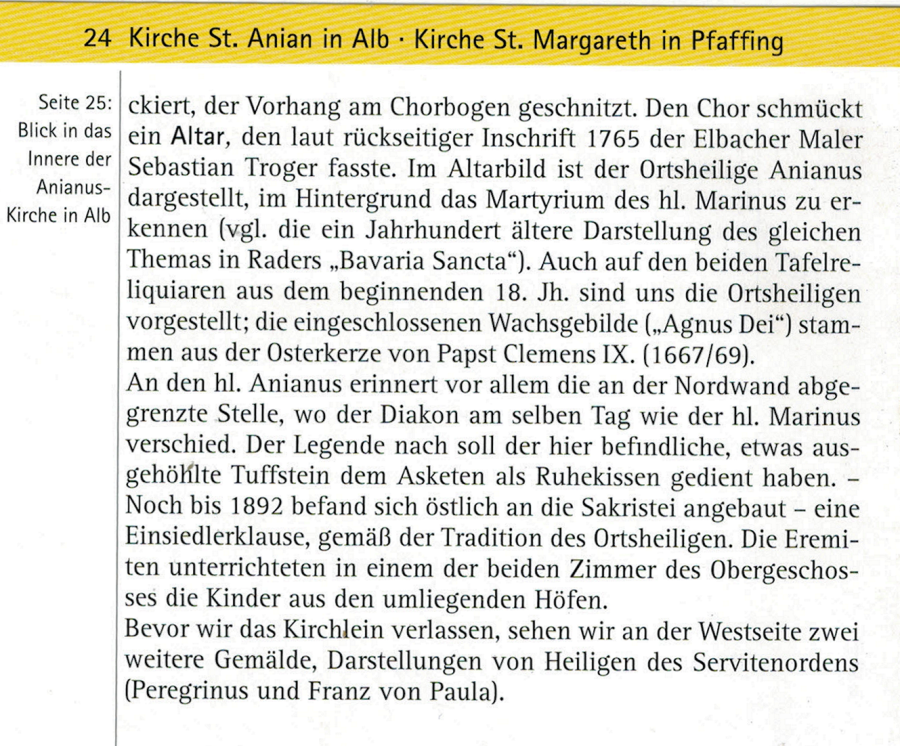 Noch bis 1892 befand sich - östlich an die Sakristei angebaut - eine Einsiedlerklause, gemäß der Tradition des Ortsheiligen. Die Eremiten unterrichteten in einem der beiden Zimmer des Obergeschosses die Kinder der umliegenden Höfe. Beim Verlassen der Kirche sehen wir an der Westseite zwei weitere Gemälde, Darstellungen von Heiligen des Servitenordens ( Peregrinus und Franz von Paula).