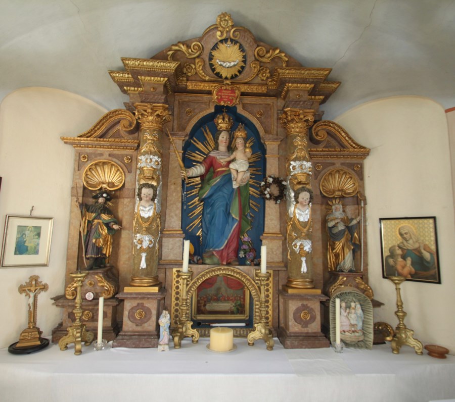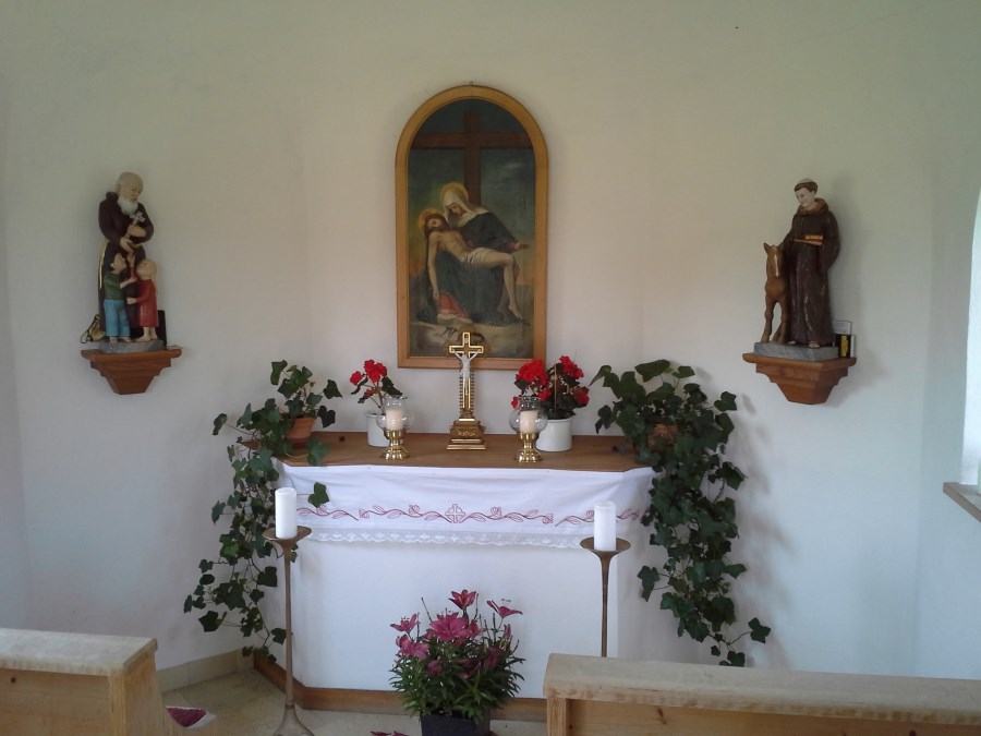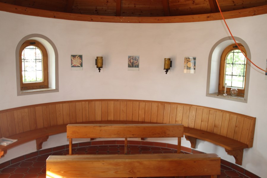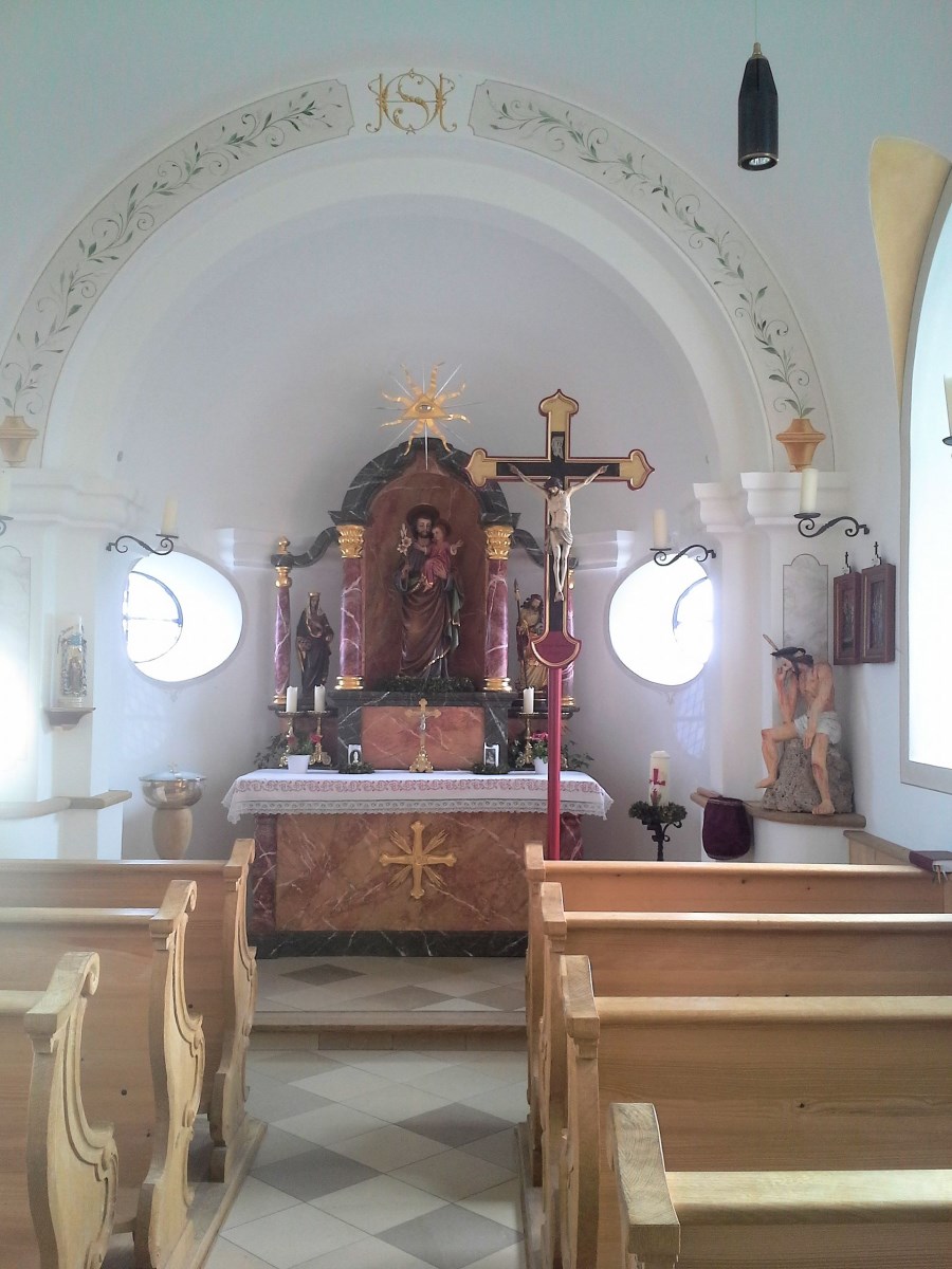 Im Untergeschoss befindet sich eine Lourdesgrotte, darüber der Sakralraum mit St. Joseph auf dem Altar und im Deckengemälde, sowie die Muttergottes mit dem Jesuskind als Figur an der Rückwand.