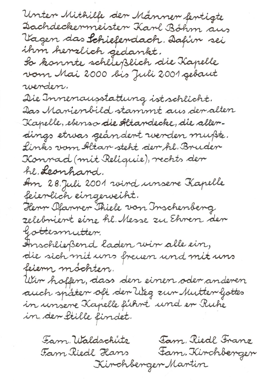 Im Jahre 2000 am 1. Advent wurde die Kapelle von Pfr. Thiele eingeweiht. Er stiftetet auch das Kreuz in der Kapelle.