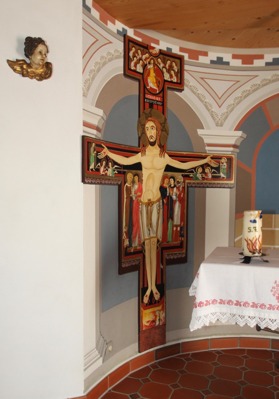 Kreuzweg-Bildstationen und vor allem die farbigen Fenster, als deren Spender sich die vier Sprengel engagierten, komplettieren den Innenraum.