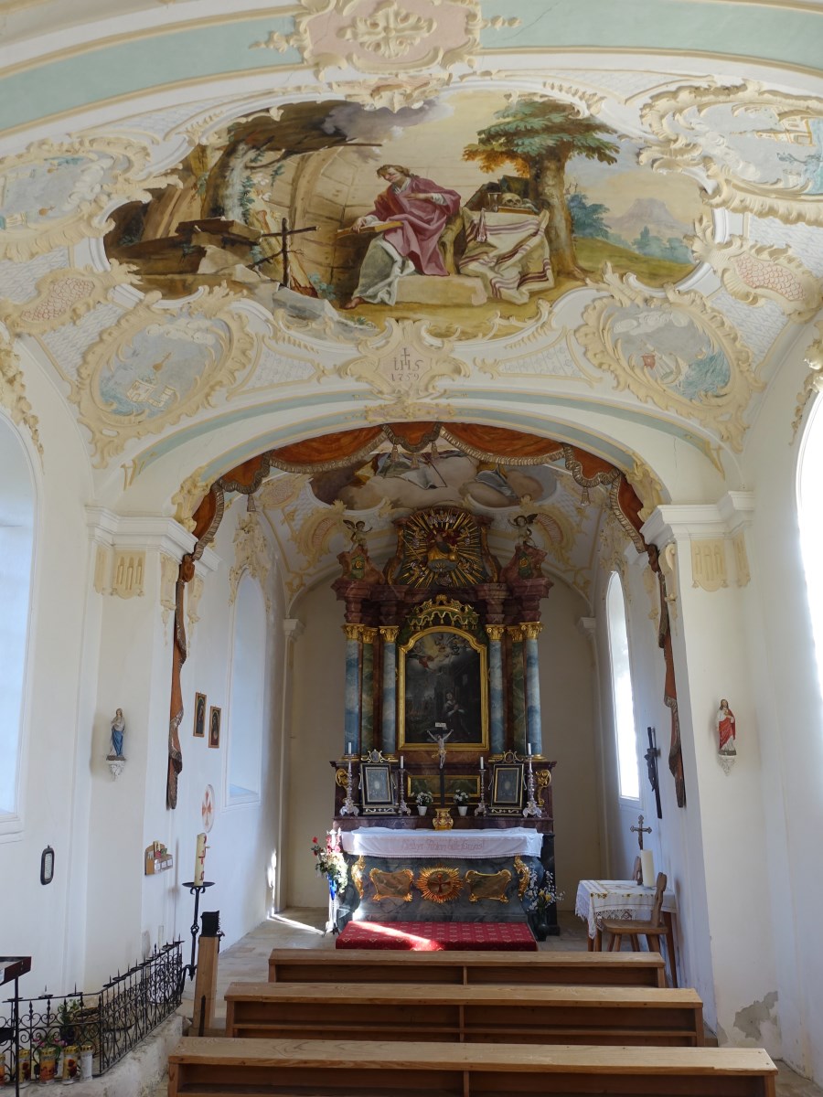 Wenn wir die 1980 renovierte Kirche betreten, fallen uns gleich drei Deckengemälde auf, die wohl ebenfalls, wie in Wilparting von Martin Heigl um 1759 geschaffen sein dürften und Szenen aus dem Leben des Ortsheiligen darstellen. Der Raum ist außerdem stuckiert, der Vorhang am Chorbogen geschnitzt. Den Chor schmückt ein Altar, den lt. rückseitiger Inschrift 1765 der Elbacher Maler Sebastian Troger fasste. Im Altarbild ist der Ortsheilige Anianus dargestellt, im Hintergrund das Martyrium des hl. Marinus erkennbar. Auch auf den beiden Tafelreliquiarien aus dem beginnenden 18.Jh, sind uns die Ortsheiligen vorgestellt;die eingeschlossenen Wachsgebilde stammen aus der Osterkerze von Papst Klemens IX. (1667/69).