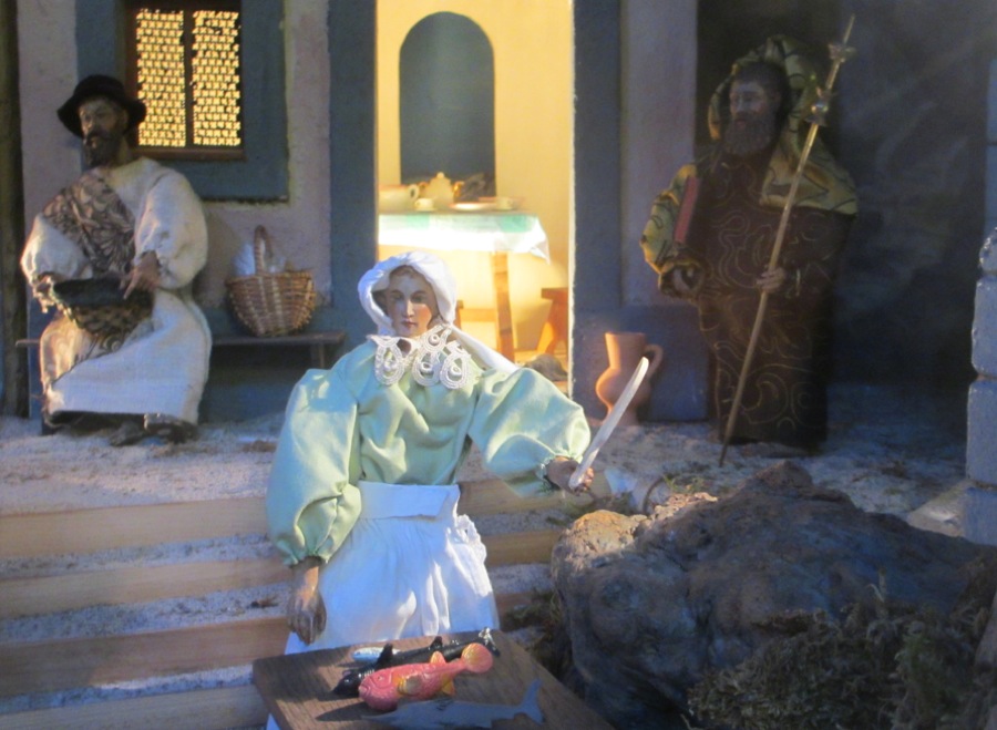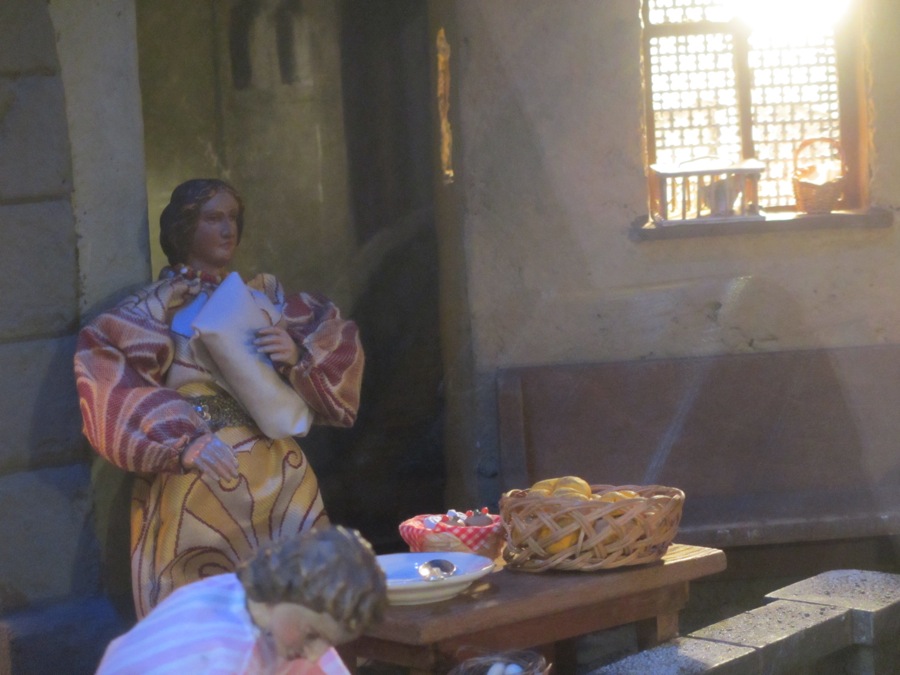 Als sie dort waren, kam für Maria die Zeit ihrer Niederkunft, und sie gebar ihren Sohn, den Erstgeborenen. Sie wickelte ihn in Windeln und legte ihn in eine Krippe, weil in der Herberge kein Platz für sie war.