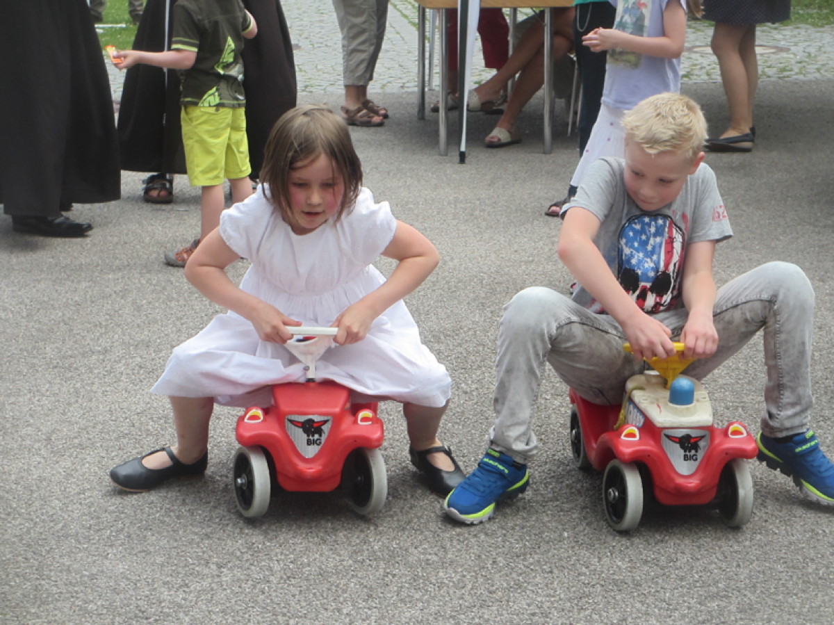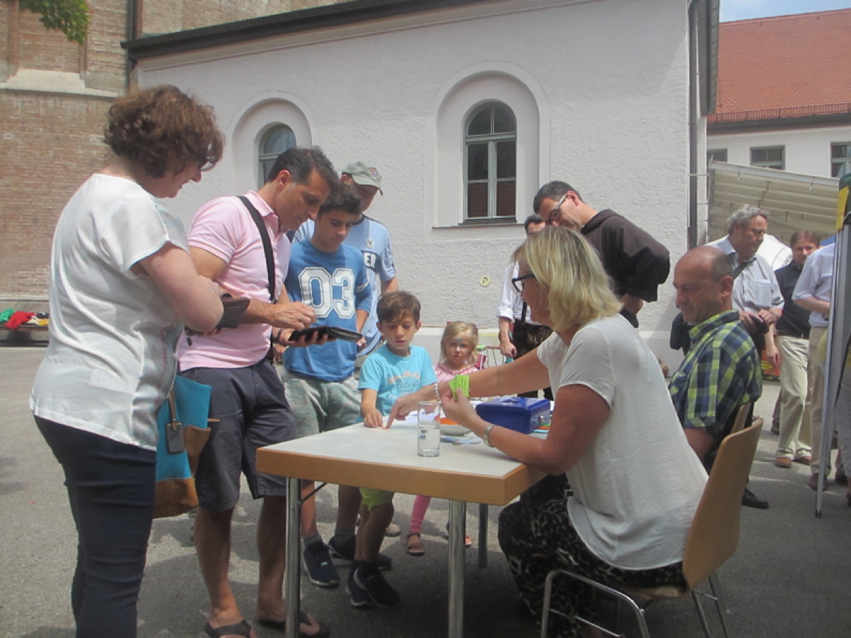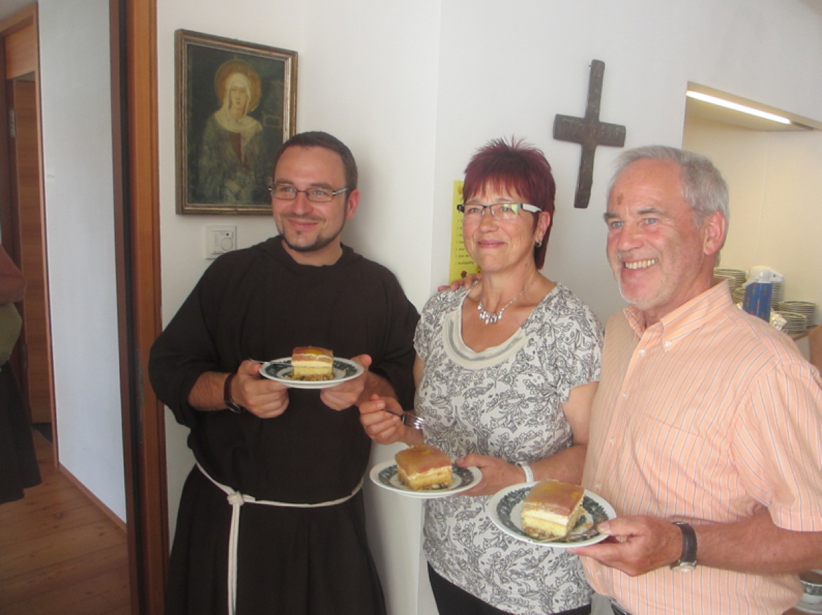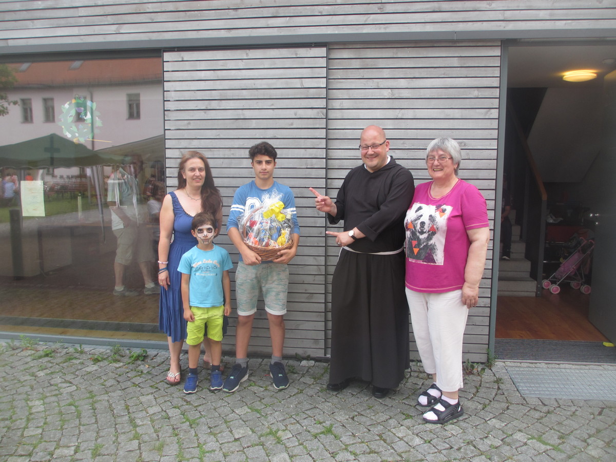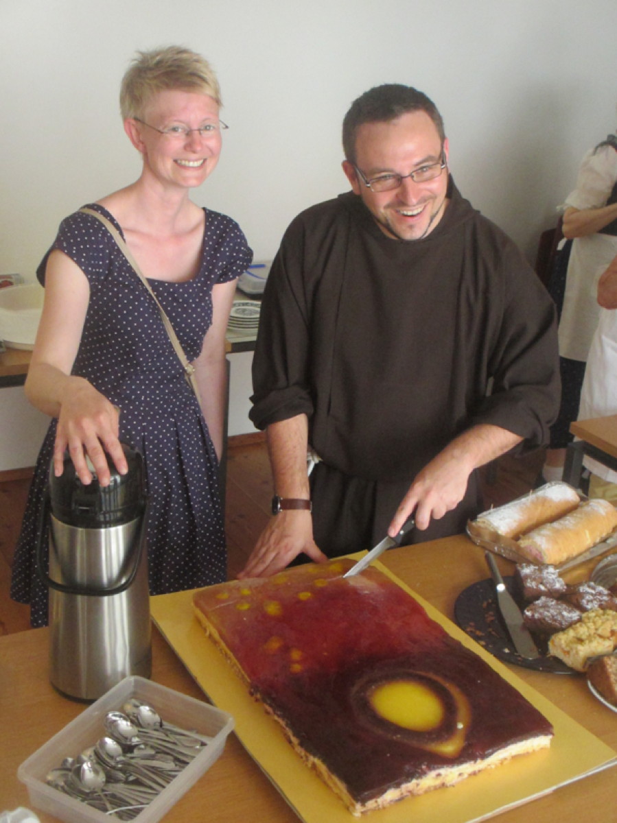 Bei strahlendem Sonnenschein war der Klostergartenbereich gut gefüllt. Es gab für das leibliche Wohl Gegrilltes Fleisch, Würstl mit Sauerkraut aber auch Vegatarisches und Salate. Die Kuchentheke war voll und vielfältig und  enthielt sogar als Attrktion eine Torte, die das Primizbild von Bruder Stefan fast in Originalgröße nachbildete. Auch Vitamine in frisch gemixten Smoothies fehlten nicht.