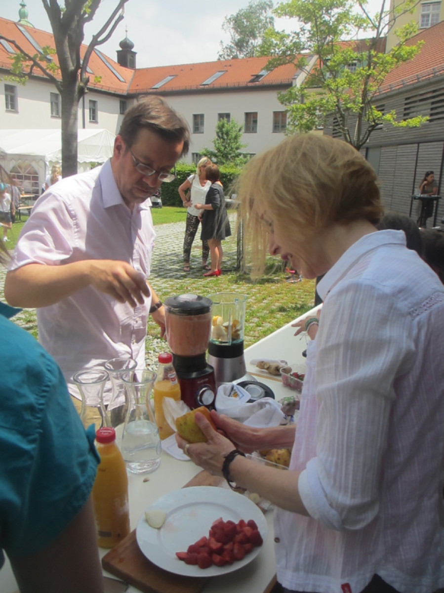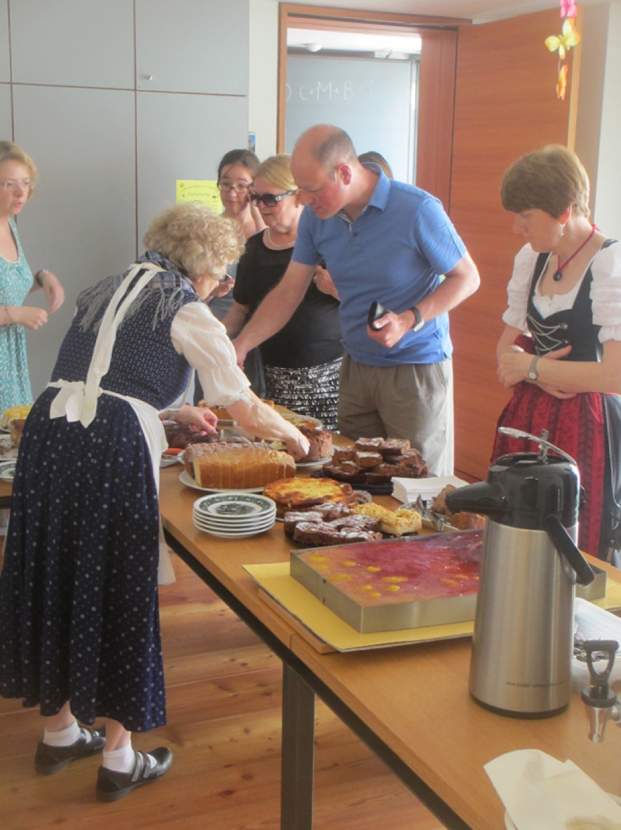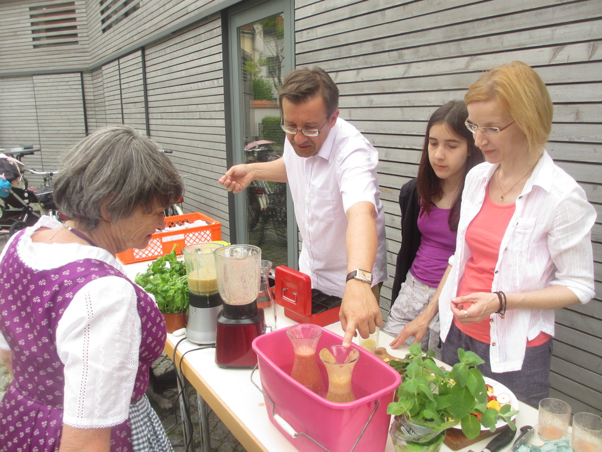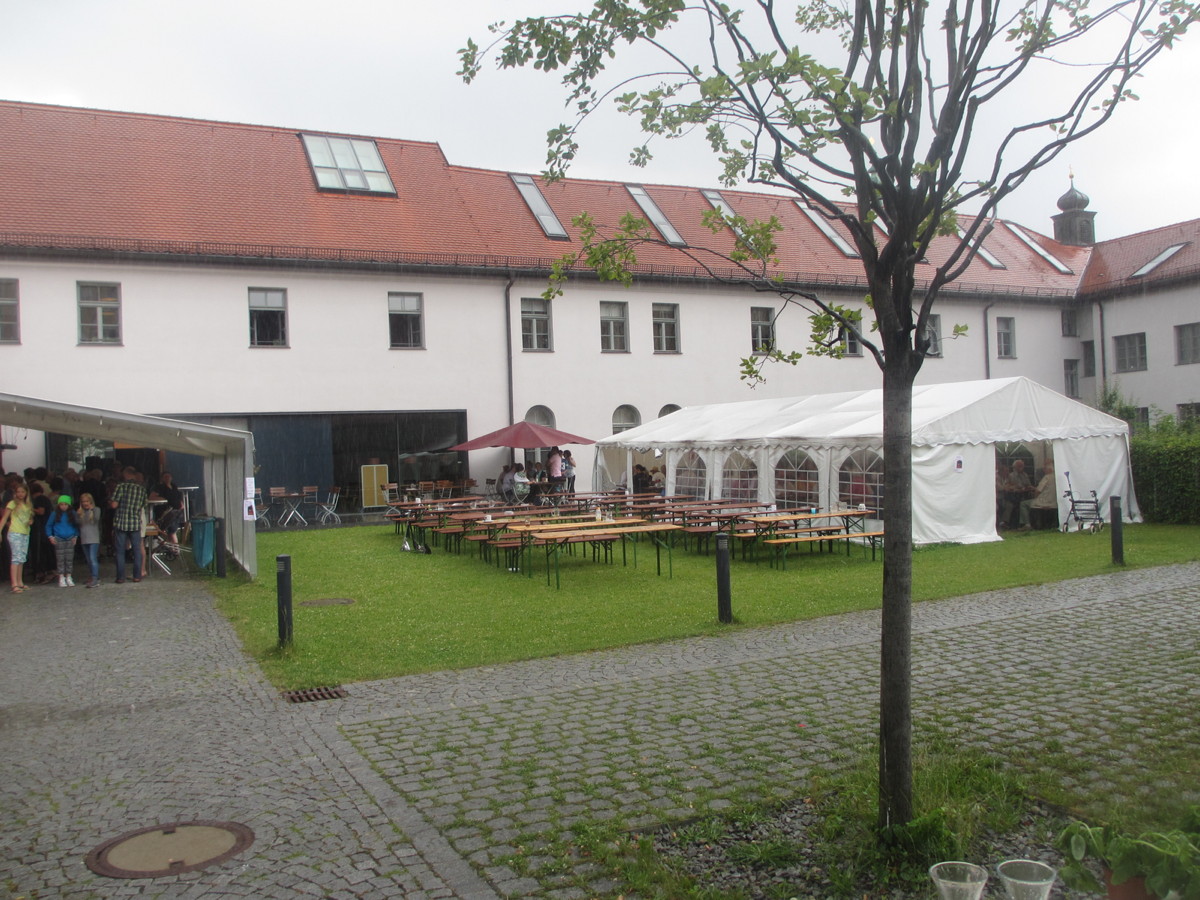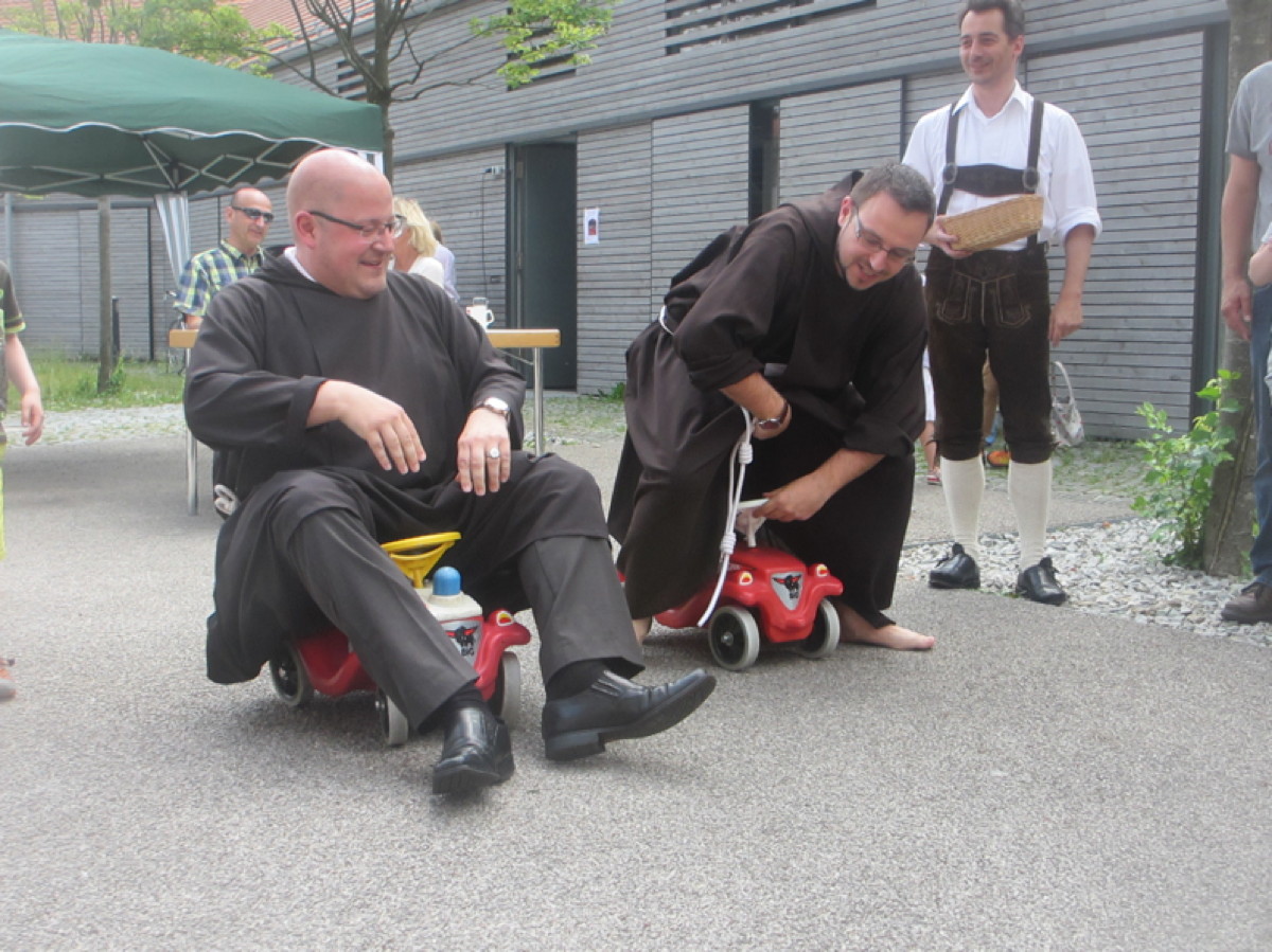 Bei strahlendem Sonnenschein war der Klostergartenbereich gut gefüllt. Es gab für das leibliche Wohl Gegrilltes Fleisch, Würstl mit Sauerkraut aber auch Vegatarisches und Salate. Die Kuchentheke war voll und vielfältig und  enthielt sogar als Attrktion eine Torte, die das Primizbild von Bruder Stefan fast in Originalgröße nachbildete. Auch Vitamine in frisch gemixten Smoothies fehlten nicht.