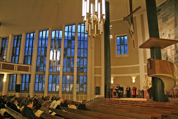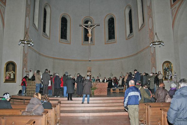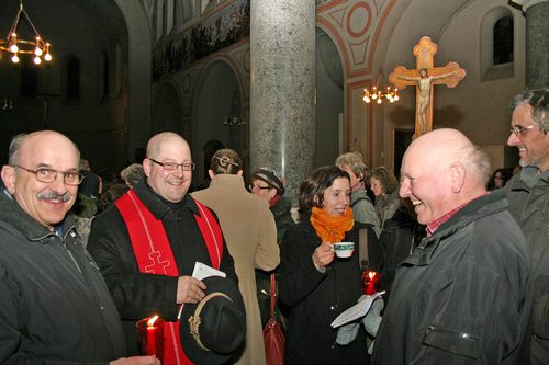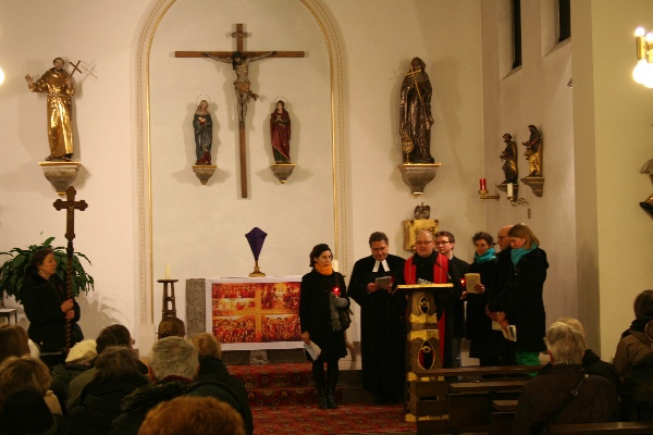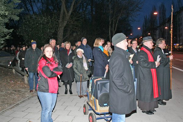 Katholische und evangelische Christen zogen gemeinsam von der lutherischen Matthäuskirche am Sendlinger Tor Platz, wo Beginn war, zur Kirche St. Stephan am Alten Südfriedhof. Im Friedhof selbst war dann die dritte Station. Am nächsten Halt in der Antoniuskirche gab es außer Gebet auch heißen Tee zum Aufwärmen. Von dort führte der Weg ins Kreszentiastift an der Isartalstraße, bevor es zum Abschluss in die Andreaskirche weiterging. Im Anschluss an den gemeinsamen, etwa zweistündigen Weg traf man sich dann im Pfarrheim St. Andreas noch zu einer Agape (Imbiss und Gespräch) zum Austausch.