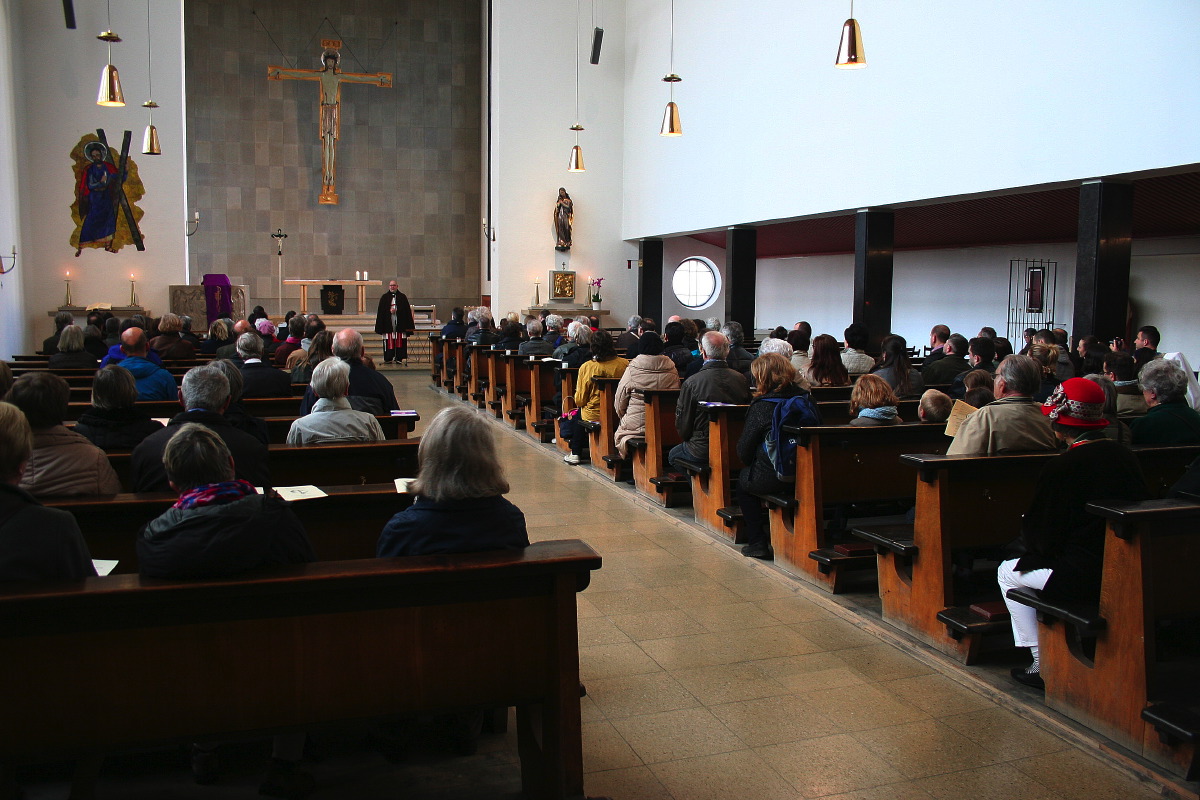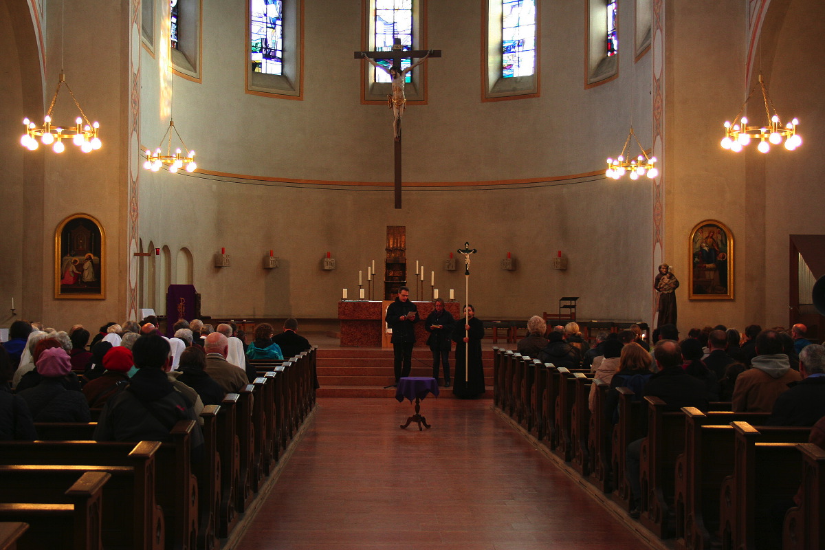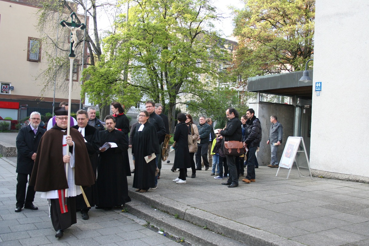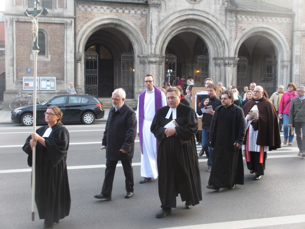 Der ökumenische Kreuzweg begann mit der Begrüßung in St. Andreas. von dort gingen die ca. 150 Christen auf dem Kreuzweg über sieben Stationen zur evangelischen St. Matthäus Kirche am Sendlinger Tor Platz.