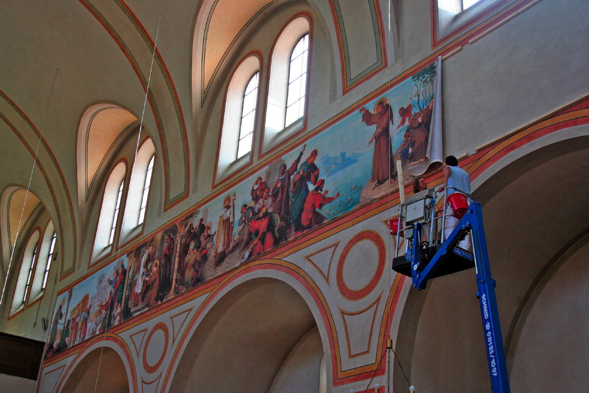 Anbringung der auf Fahnenstoffbahnen gedruckten Bändermalereien an den Hochschiffwänden (Foto. F.Ertl)