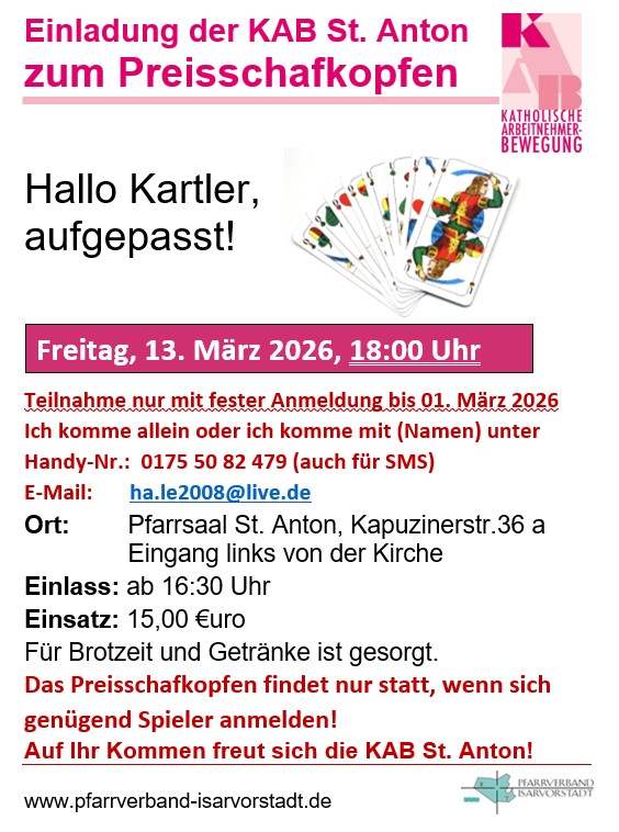 Information, Kultur, Unterhaltung, religiöse und soziale Themen und sportliche Betätigung. Es gehören dazu Vorträge, Ausflüge und zweimal im Jahr ein Preisschafkopfturnier. Alle KAB-Veranstaltungen und Treffen sind öffentlich, Gäste und auch nicht KAB’ler sind herzlich willkommen!