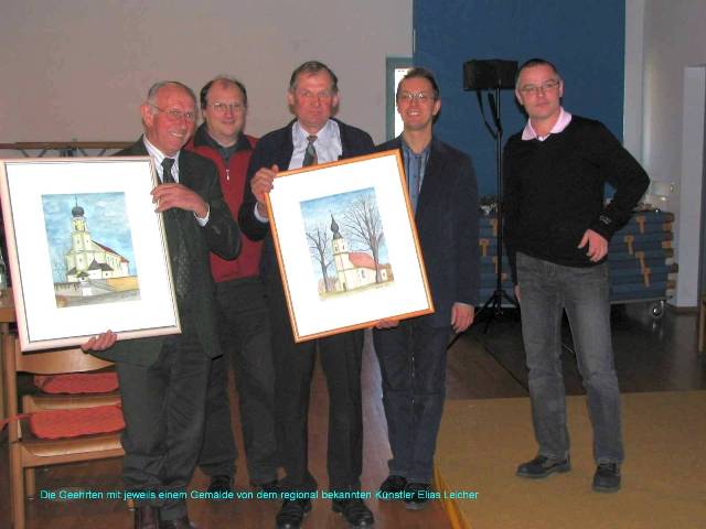 Als kleines Dankeschön der Pfarrei überreichte Pfarrer Thaller an Herrn Rahm ein Aquarell vom Kirchlein in Annabrunn und an Herrn Landenhammer ein Aquarell von der Flossinger Pfarrkirche. Beide Bilder wurden von Elias Leicher gemalt, dem hierfür ein besonderer Dank gilt.