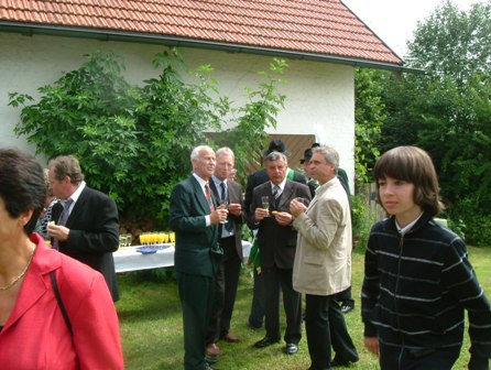 Am Schluss des Gottesdienstes ergriff Pfarrer Steiglechner selbst das Wort und lud alle Gottesdienstbesucher zum Stehempfang im Pfarrgarten ein. Dort stießen die Gäste zu seinem Wohl an.