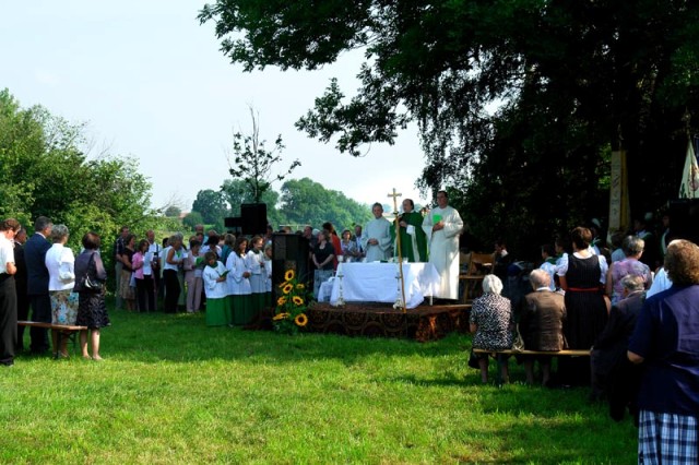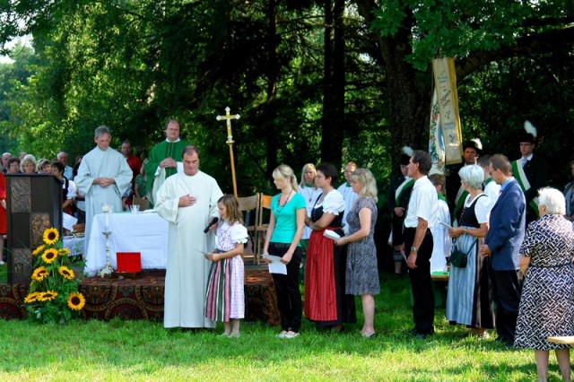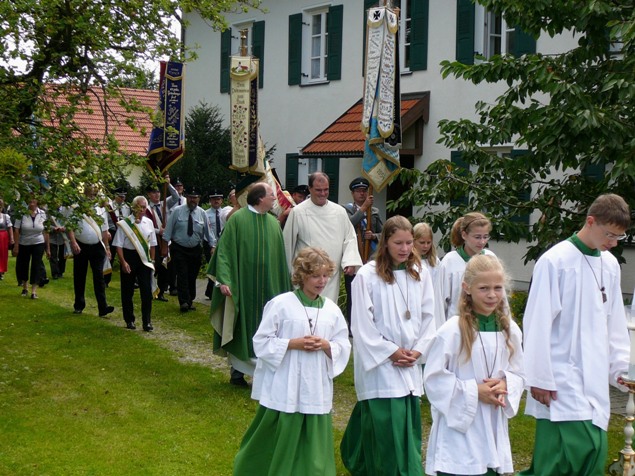 Auch Petrus hatte ein Einsehen und sorgte nach einer regnerischen Nacht für einen strahlenden Sonntag Vormittag, so dass der Festgottesdienst im Pfarrgarten stattfinden konnte. Der Gottesdienst begann mit dem feierlichen Einzug der Fahnenabordnungen und der Zelebranten.