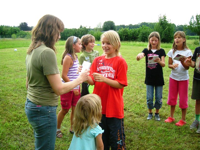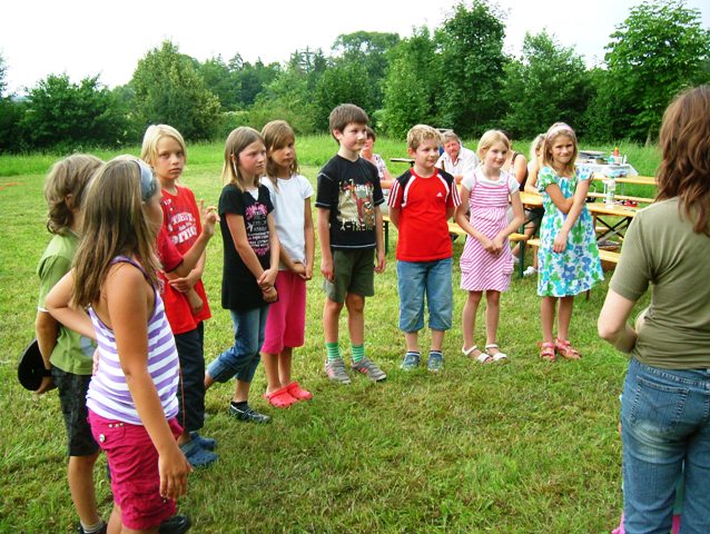 Der Hausmeister hat dann das Pflaster neu verlegt, so dass die Kinder die Hütte seit Pfingsten nutzen konnten. Weiterer Höhepunkt war die Verabschiedung der Kinder der 4. Klasse. Gruppenleiter Georg Wimmer bedankte sich bei den Kindern für die schönen miteinander erlebten Stunden und Kathleen Forrai überreichte den Kinder eine Foto-CD über die zahlreichen Unternehmungen des letzten Jahres, wie z.B. die „Schatzsuche“ auf dem Gelände des Pfarrheims, die Walderkundung mit dem Jäger Bernhard Soyer und das Projekt „Dorf“.