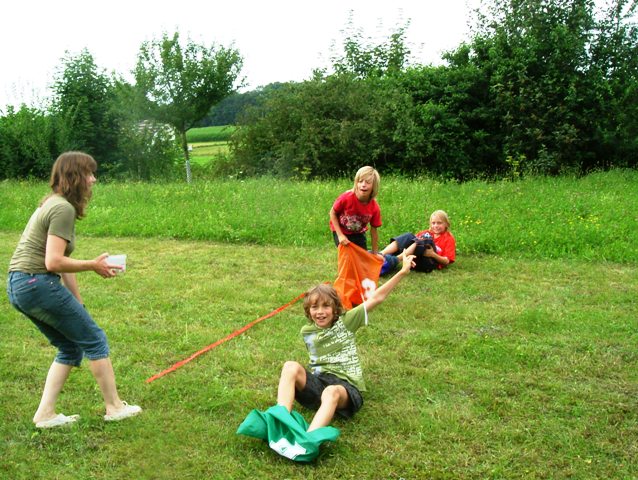 Bei herrlichem Wetter hat die Gruppenleiterin Kathleen Forrai viele Spiele für die Kinder vorbereitet, wie z.B. Sackhüpfen, Dosen werfen oder Lagerfeuer machen.