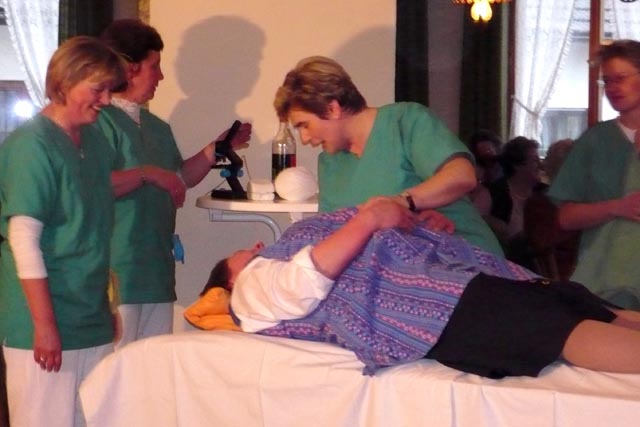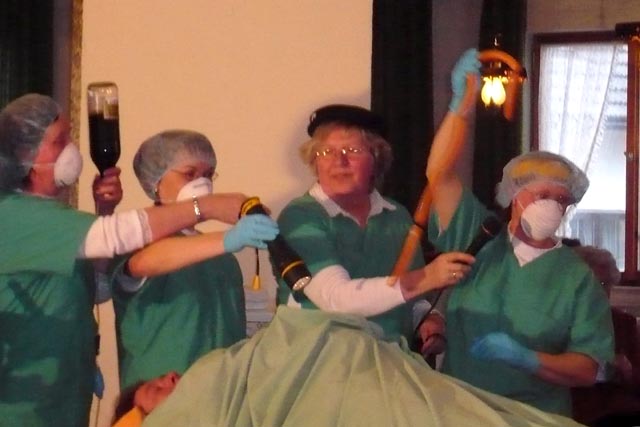 Nach einer Tanzrunde trat dann die Flossinger Notambulanz auf. Kaum war das Team vorgestellt, so musste schon eine Operation vorgenommen werden. Irmi hatte furchtbare Bauchschmerzen und so wurde sie von den Sanitätern, Monika und Roswitha auf den OP-Tisch gebracht werden. Alle staunten nicht schlecht, was da bei dem Eingriff alles zum Vorschein kam.