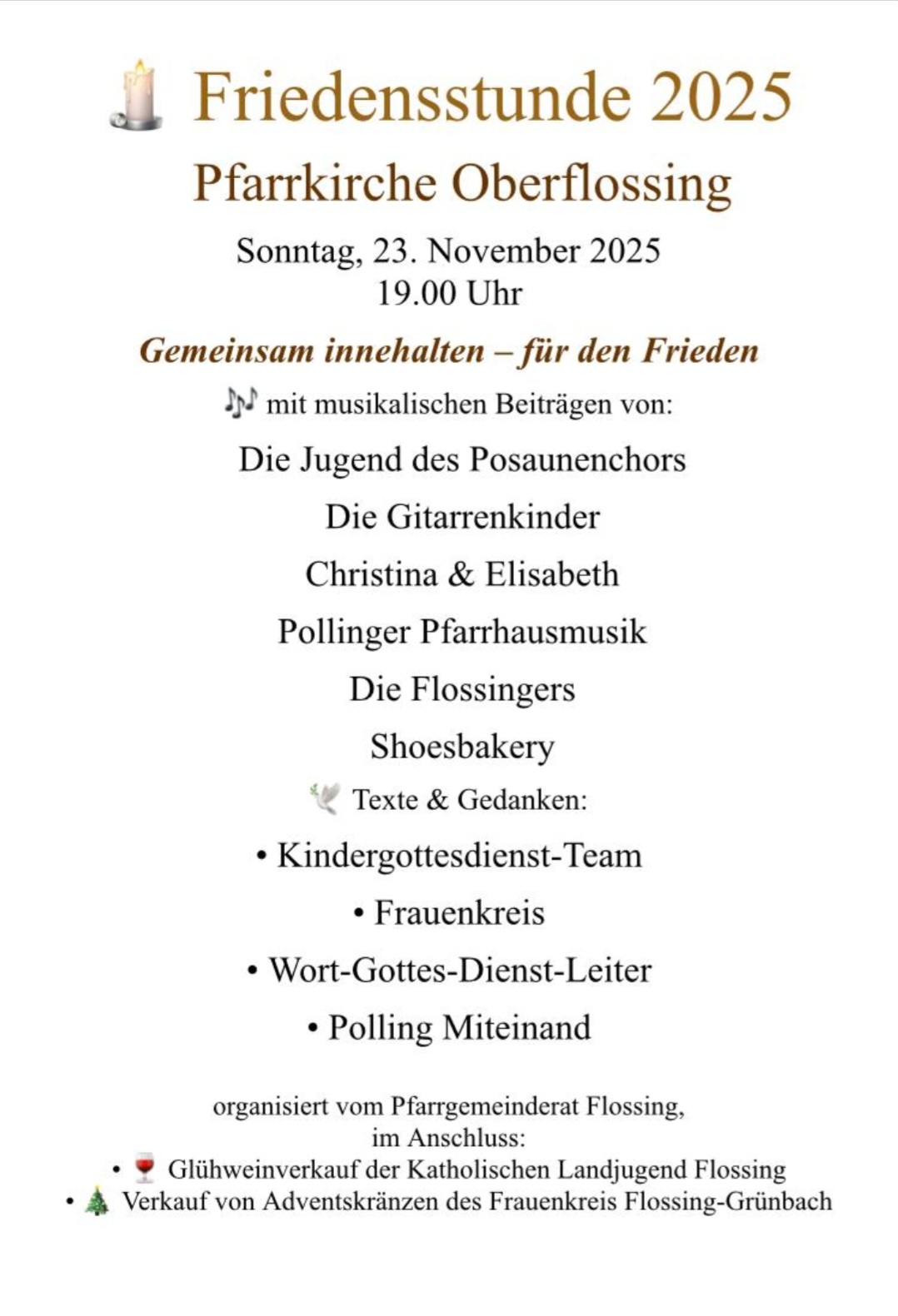 Zwischen den musikalischen Stücken gestalteten das Kindergottesdienst-Team, die Wortgottesdienstleiter, der Frauenkreis sowie die Aktion „Polling miteinander“ besinnliche Texte, die das Thema Frieden aus unterschiedlichen Blickwinkeln beleuchteten. Dabei entstand eine eindrucksvolle Verbindung aus Musik, Worten und Stille.