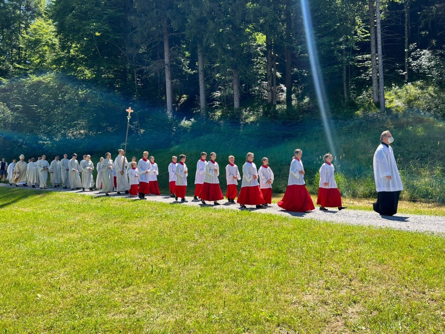 Mit wunderbarer geistlicher Abendmusik des Kirchenchors Nußdorf und anderen Musikgruppen wurde am 01. Juli das Festwochenende eingeleitet. Der Samstag lud zum persönlichen Gebet ein, aber auch um in Gemeinschaft zu beten. Nach einer Rosenkranz Andacht um 10 Uhr wurde das Allerheiligste ausgesetzt. In der Ewigen Anbetung, die um 18 Uhr endete, fanden um 13 Uhr eine Andacht zu Maria, um 15 Uhr eine Familienandacht mit dem Thema Begegnung und zum Abschluss um 17 Uhr eine Jugendandacht mit dem Thema Zeit statt. Besonders an diesem Wochenende waren viele Besucher im Kirchwald unterwegs.