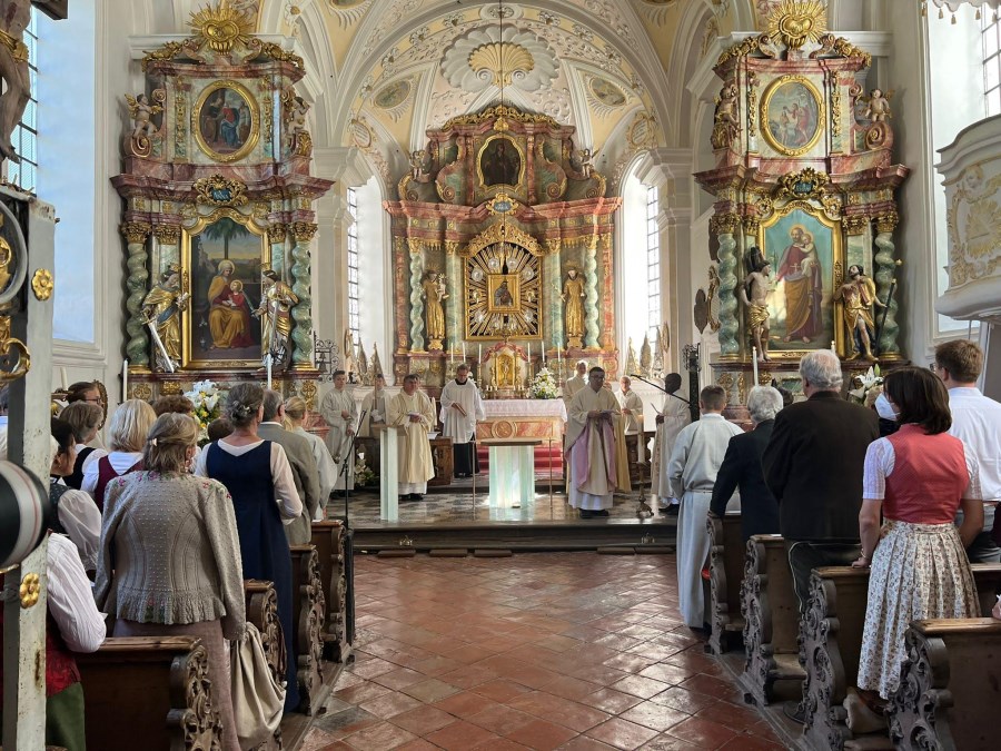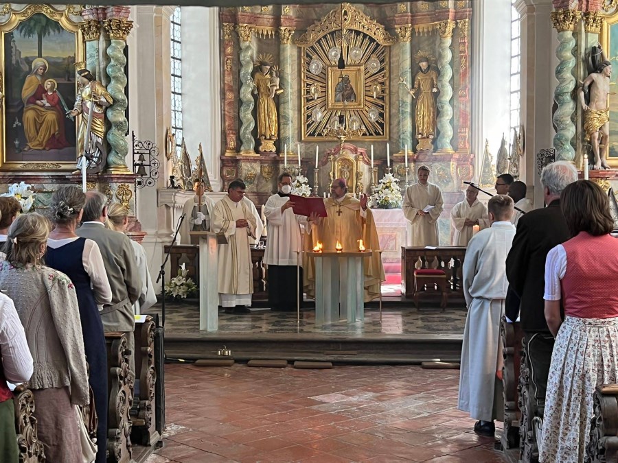 Ein Highlight war dann der Festgottesdienst am Sonntag, 03. Juli. Gemeinsam mit Weihbischof Wolfgang Bischof feierten Pfarrer Christoph Rudolph, Pfarrer Godfrey Bamuganyire (Urlaubsvertretung von Pfr. Rudolph), Diakon Günther Schmitzberger aus dem Pfarrverband Rohrdorf, sowie Gemeindereferentin Gundula Langer und Gemeindeassistentin Jacqueline Egold, außerdem ganz vielen Ministrant*innen, einen feierlichen Gottesdienst. Ein wahrer Höhepunkt des Gottesdienstes war die Weihe des neuen Altars. Der vom Künstler Florian Lechner aus Nußdorf gestaltete Altar fügt sich perfekt in die Atmosphäre des Raumes ein. Besonders, wenn das Licht durch das Fenster im Altarraum einfällt, ergibt sich ein herrliches Lichtspiel mit den gläsernen Füßen des Altars. Ein Besuch im Kirchwald zum Entdecken des neuen Altars und Ambos lohnt sich in jedem Fall.