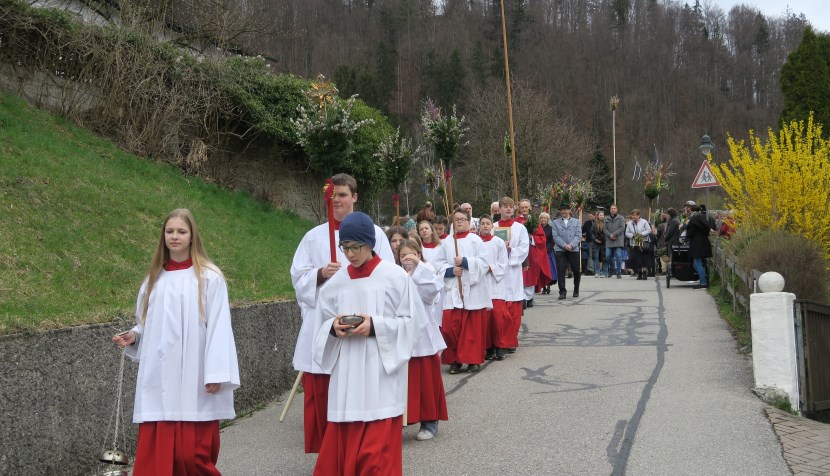 Am Palmsonntag versammelten sich viele Gläubige beim Aufgang zur alten Pfarrkirche, um des Einzugs Jesu in Jerusalem zu gedenken.