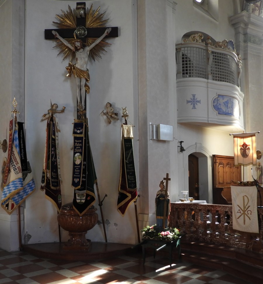 Herr Eckart von Zorn vom Pfarramt führte unsere 38 Teilnehmer durch die Kirche und erzählte uns über die Geschichte des Gotteshauses. Besonders interessant ist das sogenannte Schaftlacher Kreuz. Es datiert aus dem 10. Jahrhundert und gehört zu den ältesten noch erhaltenen Monumentalkruzifixes. In der Kirche wird außerdem eine Kreuzreliquie aufbewahrt.