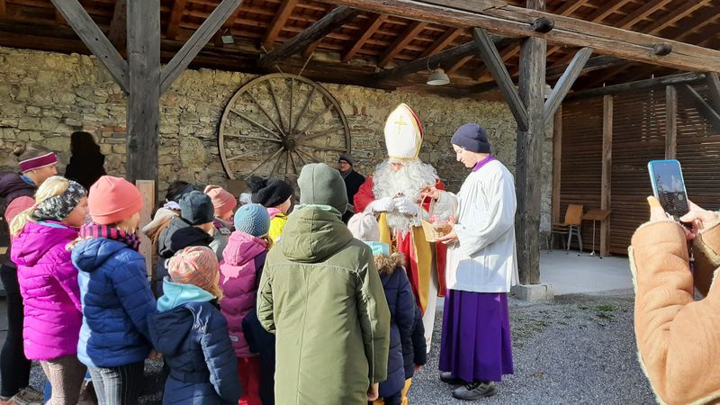 Als der heilige Nikolaus persönlich einzog, war die Freude groß. Er sprach zu den Kindern, lobte ihren Einsatz und erinnerte an das Gute, das jeder in die Welt bringen kann. Anschließend verteilte er an alle Kinder Schokonikoläuse, was für strahlende Gesichter sorgte.