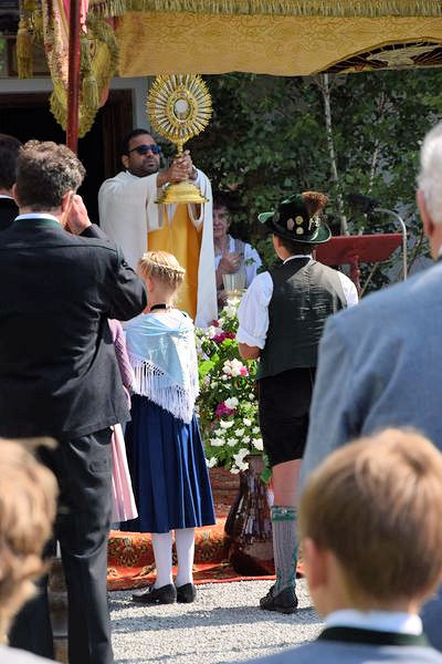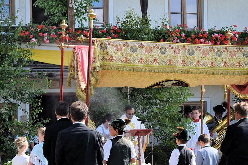 Bei der Prozession trug Pfarrer Huber die Monstranz mit dem Allerheiligsten unter dem Himmel – ein sichtbares Zeichen des Segens und der Gegenwart Gottes inmitten der Gemeinde.