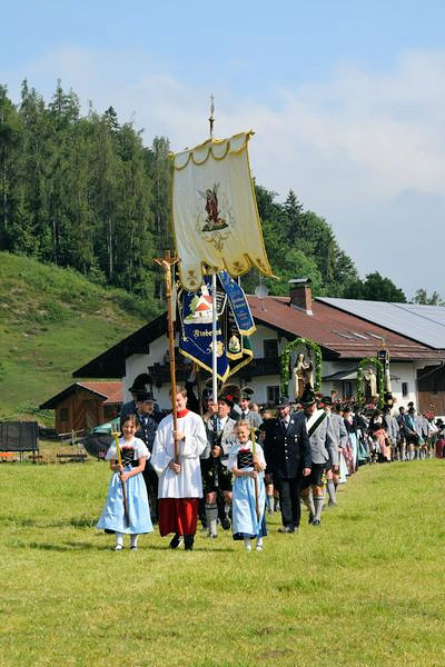 Die anschließende Skapulierprozession mit Beteiligung der Ortsvereine wie der Trachtenverein und Musikkapelle Niederaudorf, den Audorfer Gebirgsschützen und den Fahnenabordnungen sowie zahlreicher Gottesdienstbesucher führte durch Reisach über 2 Feldaltäre zurück zum Kloster, wo der Segen gespendet wurde.