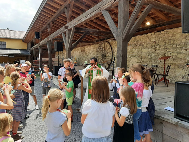 Im Rahmen des Klosterfestes lud der Pfarrgemeinderat Niederaudorf/Reisach zum alljährlichen Kinderfest im Klosterhof ein. Bei angenehmen Temperaturen versammelte man sich zum Kindergottesdienst, den Pater Paul inmitten der zahlreich erschienen Kinder zelebrierte. Unter dem Motto: "Jesus segnet die Kinder" wurde kindgerecht aus dem Matthäus-Evangelium die liebevolle Begegnung von Jesus mit den Kindern erzählt. Jedes Kind erhielt von P. Paul einen Einzelsegen sowie eine Papierblume mit einem Segenswunsch zum Weitergeben. Musikalisch unterstütze Birgit Sporer mit dem Kinderchor die lebendige und fröhliche Andacht.