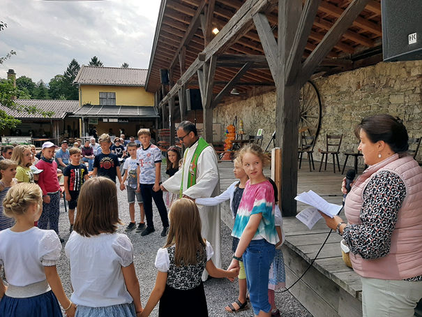 Pfarrgemeinde unter den Remisen des Klosters Reisach die heilige Messe. "Langsam, langsam... wir haben wenig Zeit" hieß es in der Predigt von Pater Paul, der zu Ruhe und Besinnung im hektischen und schnellen Alltag aufrief. Musikalisch begleitete Birgit Sporer den Gottesdienst mit ihrem Kinderchor.