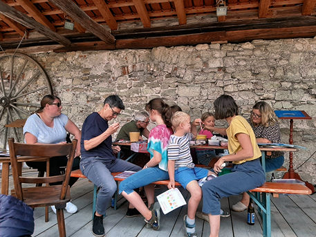 Zwischendurch war eine Stärkung mit Kaffee und Kuchen sowie gekühlten Getränken und Würstel an einem Schattenplatz unter Sonnenschirm oder Remisen des Klosterhofs möglich.