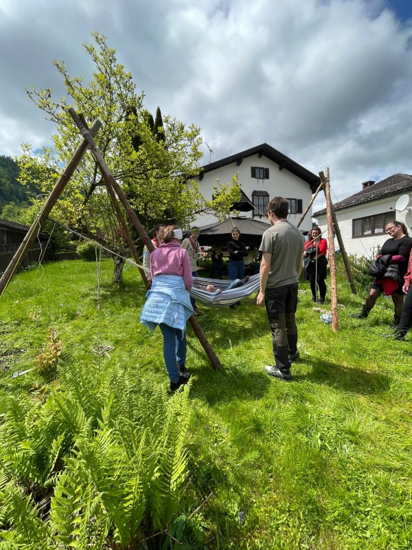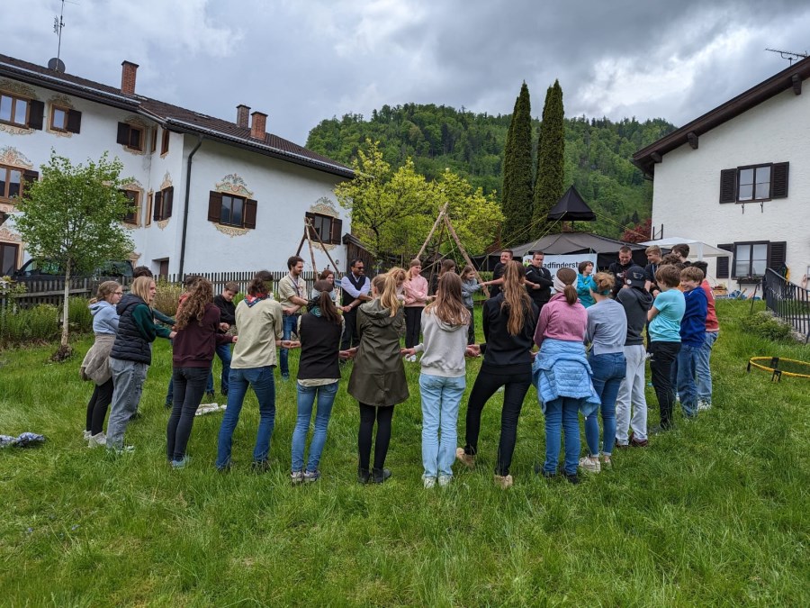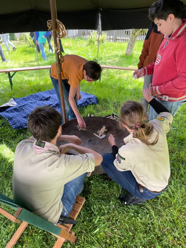 Nach einem gemeinsamen Gottesdienst in der Pfarrkirche Oberaudorf und einer herausragenden Brotzeit, organisiert von den Firmhelfern, durften die Jugendlichen im Pfarrgarten Oberaudorf einige pfadfinderische Aktivitäten testen. In unserem Schwarzzelt, auch Jurte genannt, durften die Jugendlichen mit Feuerstahl und Holzbohrer versuchen ein Feuer zu machen, sowie mit einem Brenneisen Holzscheiben verzieren. Zwei weitere Feuerschalen standen bereit, um Stockbrot und Schokobananen zu machen und gesellig zusammen zu sitzen. Mit Holzstämmen wurden zwei Dreibeingestelle gebaut und dazwischen eine Hängematte gespannt. Ebenso standen einige Spiele (z.B. Wikingerschach) bereit.