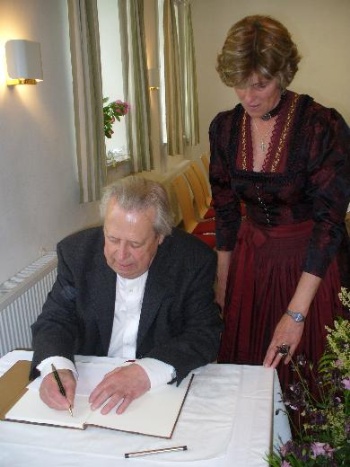 Unser langjähriger Ruhestandspriester Rudolph Niederreuther feierte in Umrathshausen sein 50-jähriges Priesterjubiläum und trug sich bei einem Festakt im Frasdorfer Pfarrheim in das goldene Buch der Gemeinde Frasdorf ein, das ihm Bürgermeisterin Marianne Steindlmüller reicht.