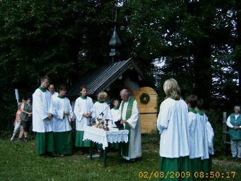 Auch dieses Jahr gingen die Gläubigen - das Rosenkranzgebet betend - als Vorbereitung der Bergmesse zur Schmiedalm. Dieses Jahr war auch eine evangelische Familie dabei, deren Tochter konfirmiert werden will. Dafür muss sie aber nachweisen können, dass sie mindestens 10 Gottesdienste besucht hat, es dürfen auch katholische Gottesdienste sein. Und so nahm die ganze Familie an der Gebetswanderung und auch an der Bergmesse teil.