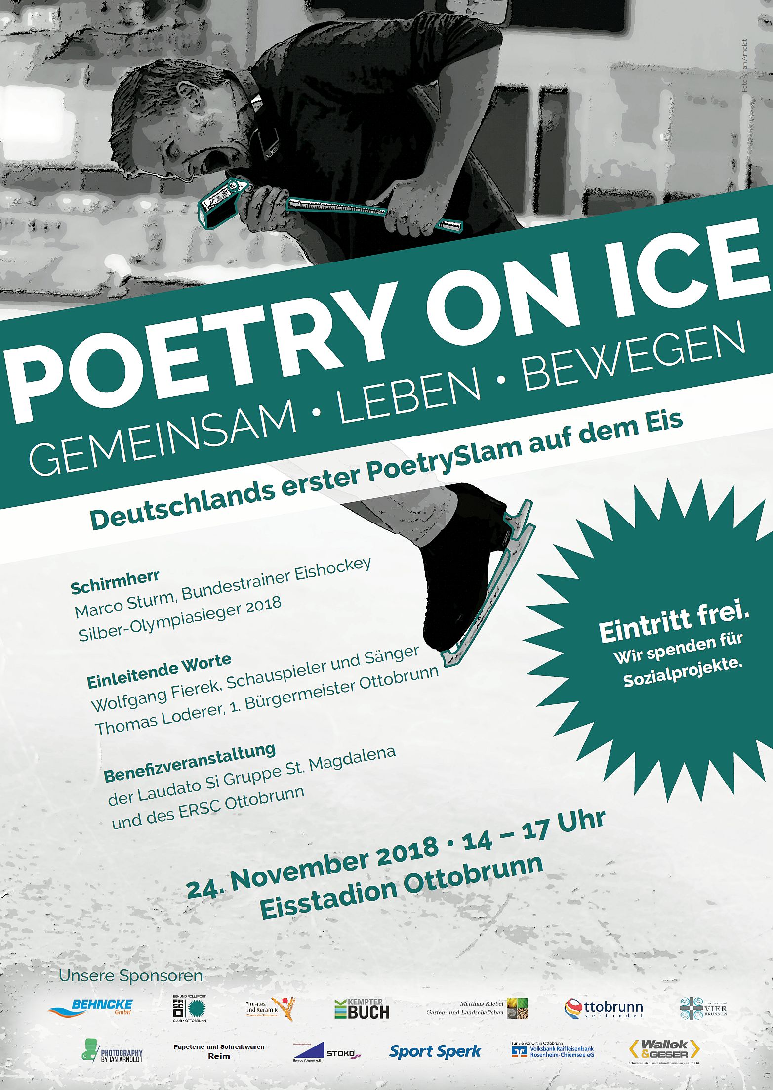 Der Poetry Slam fand in Kooperation mit dem ERSC (Eis- und Rollsportclub) Ottobrunn von 14 - 16.30 Uhr auf einer für die Veranstaltung reservierten Hälfe des Sta-dions statt. Nach einleitenden Worten von Ottobrunns Bürgermeister Thomas Loderer und einem Grußwort des Schauspielers Wolfgang Fierek trugen 15 "Slammer" im Alter von 14 - 73 Jahren ihre eindringlichen auf das Lau-dato-Si-Thema "Sorge um unser gemeinsames Haus - die Erde" abgestimmten Texte vor. Teilweise selbst als Eisläufer und teilweise auf einem Vortragsteppich und begleitet von Vorführungen der Eiskunstläufer des ERSC setzen sie sich dabei hoch motiviert für den guten Zweck ein.
