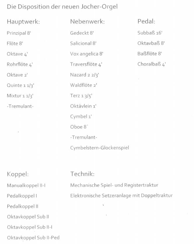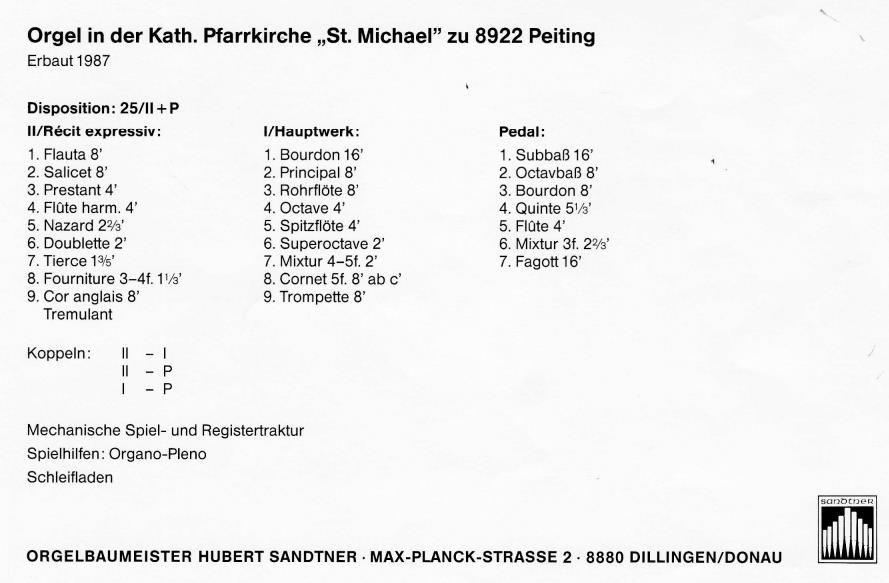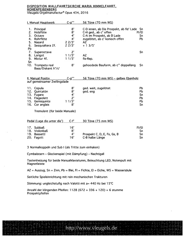 Das fachlich und künsterrisch hervorragend gestaltete Werk setzt ein besonderes Zeichen in der bayrischen Orgellandschaft. Eine Vielzahl von Registrierungsmöglichkeiten lassen sich realisieren. Mit der ausgebauten Suboktavkoppel im Nebenwerk bekommt das Instrument einen wunderbaren gravitätischen Gesamtklang, den man nur von wesentlich größeren Orgeln her kennt. Auf diese Weise kann besonders romantische Orgelliterartur authentisch interpretiert werden.