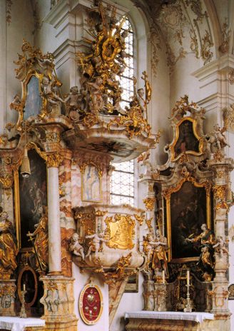 Die Kanzel und zwei Seitenaltäre geschaffen von Matthias Fackler und Chr. Jorhan d.Ä.