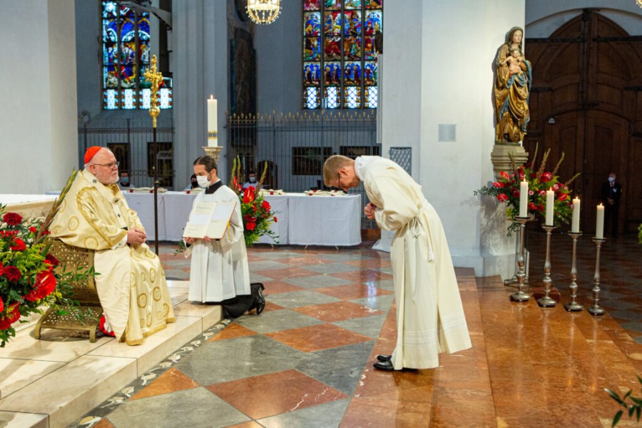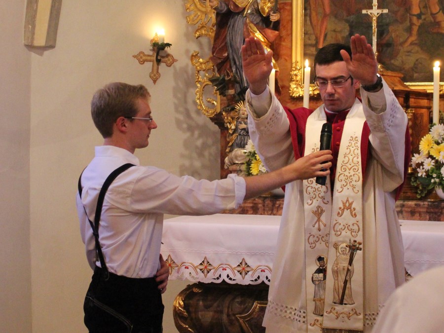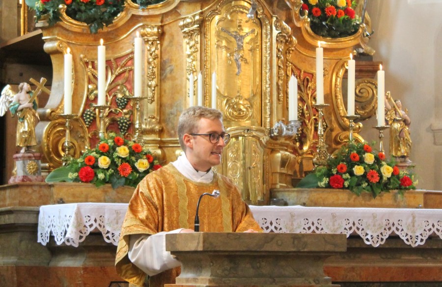 Pfarrer Roman Majchar stellte an den Anfang den Dank an die Gläubigen, die über die vergangenen Jahre hinweg für Tobias Pastötter beteten und bat, dies weiterhin zu tun. In St. Martin in Saaldorf dankte er auch jenen Gottesdienstbesuchern, die aus Platzgründen vor der Kirche am gemeinsamen Gebet teilnahmen. Besonders freue ihn, dass der höchste politische Vertreter des Landkreises, Landrat Bernhard Kern, am Gottesdienst teilnehme, ebenso wie Bürgermeister Andreas Buchwinkler und seine beiden Stellvertreter Maximilian Lederer und Robert Eder. Außer dass Jesus in die Mitte genommen werde, sei das allerwichtigste des heutigen Gottesdienstes, dass der frisch geweihte Diakon Tobias Pastötter in seiner Heimatgemeinde seine erste Predigt halte. Ziel von Pastötter sei, Priester zu werden, das Diakonamt eine Zwischenstation.