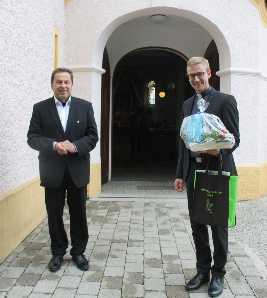 Am Ende des gemeinsamen Gottesdienstes in St. Martin wünschte Pfarrer Roman Majchar Tobias Pastötter Gottes Segen auf seinem weiteren Weg. Diakon Pastötter erwiderte, dass er sich freue, daheim sein zu dürfen bei seinen funktionierenden Beziehungen. Wegen der Gesundheitsschutzmaßnahmen fand der geplante Stehempfang im Pfarrheim nicht statt. Wer wollte, konnte bei ausreichend Abstand vor der Kirche noch mit Tobias Pastötter persönlich sprechen. Hier bekam er von den Gemeindebürgern erneut viele gute Worte mit auf dem Weg.