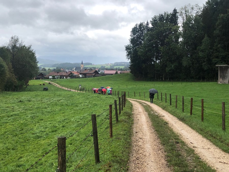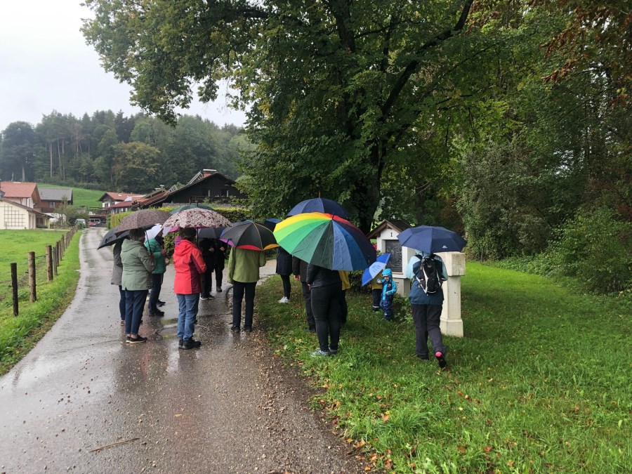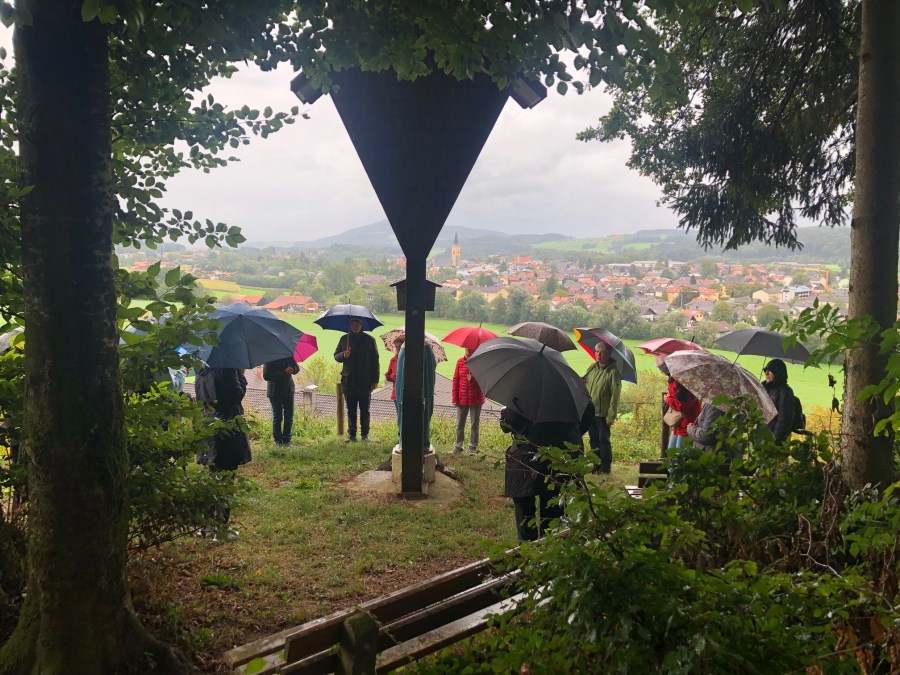 18 Personen trotzten dem Regen und hörten an den 14 Kreuzwegstationen berührende Texte über ungeborene Kinder und ihre Mütter. Oben angekommen wurden sie mit der fantastischen Sicht auf Teisendorf belohnt.