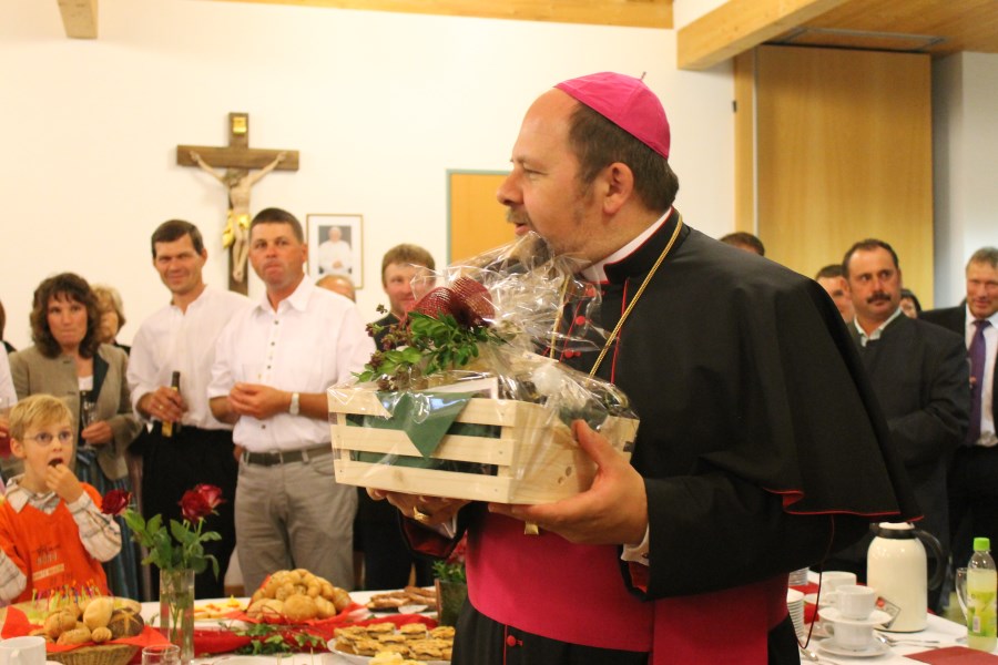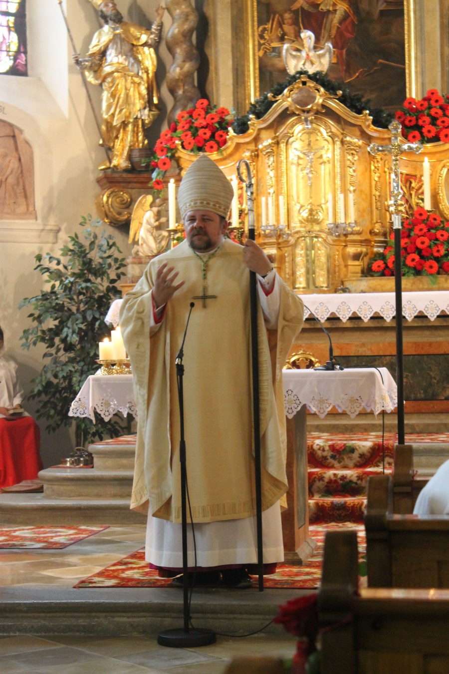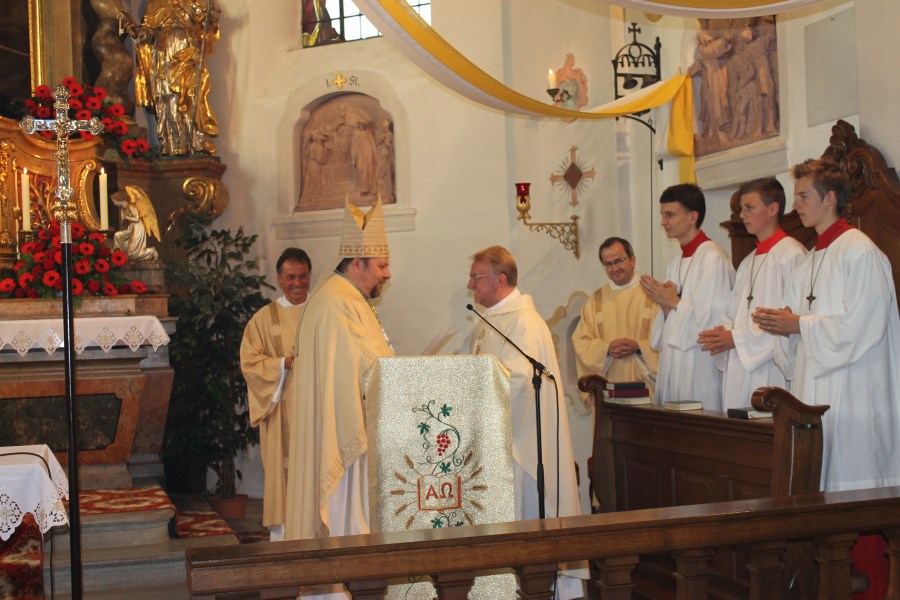 Weihbischof Wolfgang Bischof besuchte das erste Mal unsere Pfarreien anlässlich der Firmung und zu diesem Pontifikalamt. Diese sehr feierliche Eucharistiefeier mit Verlesung des Dekrets durch Diakon Friedl und Übergabe der Urkunde wurde von Chören aus beiden Pfarreien musikalisch gestaltet und nach der eindrucksvollen Predigt von Weihbischof Bischof drückten die Pfarrgemeinderäte und Kirchenverwaltungen durch eine Symbolhandlung aus, dass der Weg nun gemeinschaftlich weitergeht.