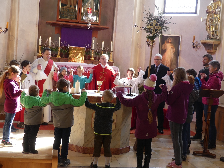 Anfangs hatte Pfarrer Majchar besonders die Eltern der Erstkommunionkinder begrüßt. Die Kinder trugen im Lauf des Gottesdienstes Bußgedanken, Kyrierufe und Fürbitten vor. Das Vater Unser wurde gemeinsam im Altarraum gesungen.