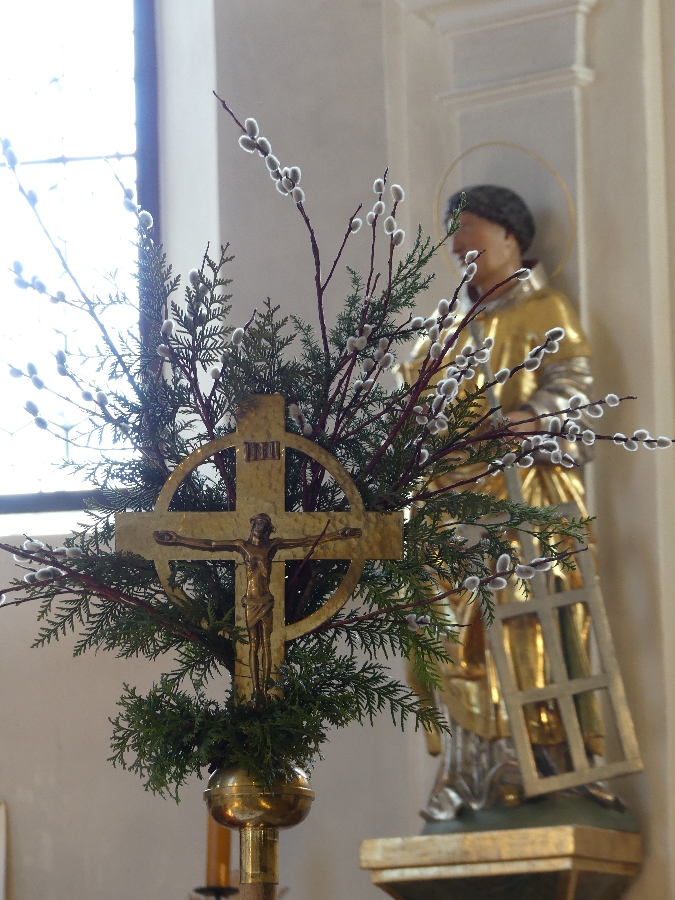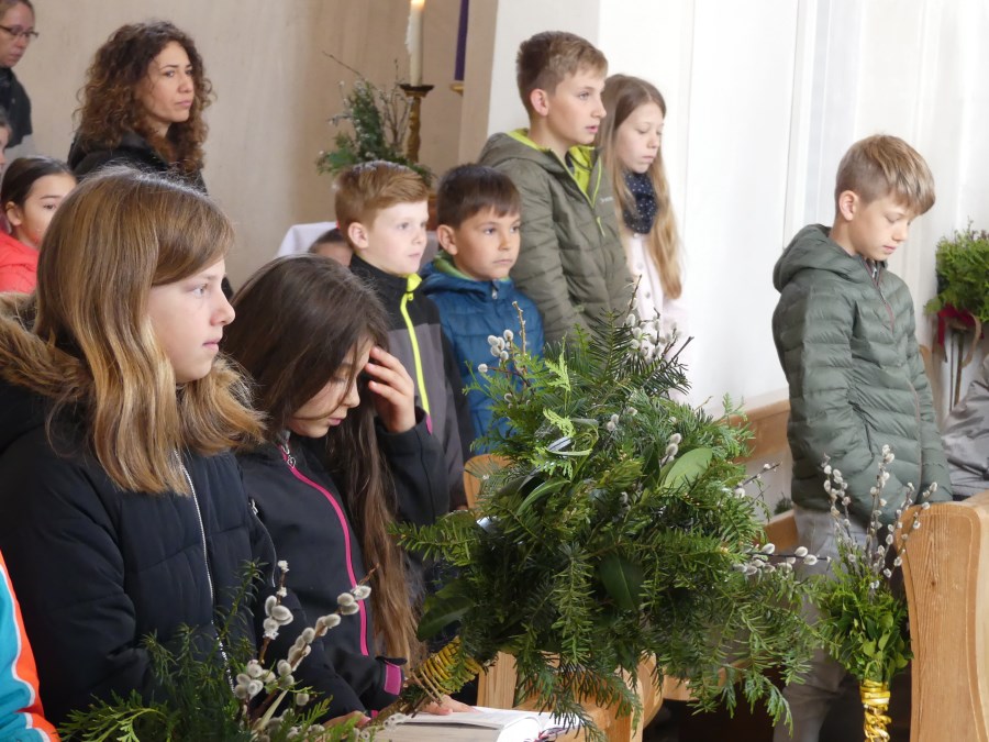 Die Kinder begrüßten Jesus in Saaldorf mit dem Kreuzzeichen und dem Mitmachlied „Gott mag Kinder”. In sehr liebevoller Weise brachten beide Teams der Familiengottesdienste den Kindern die Geschichte nahe, was die Kirchengemeinde am Palmsonntag feiert. Sie beschrieben kindgerecht den Einzug Christi auf seinem Esel in die Stadt Jerusalem, wo er laut Überlieferung von seinen „Freunden”, den Jüngern begleitet worden war. Wie die Menschen Jesus bei seinem Einzug als König feierten, ihm mit Zweigen zuwinkten und Kleider auf die Straße legten. Dass er auf einem Esel, ohne Krone und Zepter und ohne prächtiges Schloss kam, dafür aber sehr viel Liebe im Herzen mitbrachte, die Kinder liebte, dass er Kranke heilte und Blinde sehend machte.