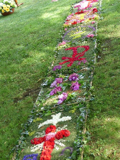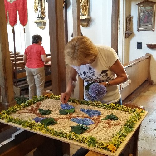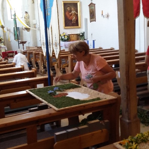 Auch dieses Jahr wurde der Fronleichnamstag von den Christen des Pfarrverbandes am Vortag mit dem Schmücken der Statuen und das Legen des Blütenteppichs begonnen.
