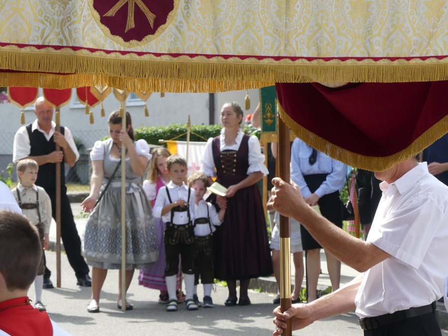 Im Anschluss setzte sich die traditionelle Prozession in Bewegung. Angeführt von den Kirchenfahnen, begleitet von den Ministranten, den Musikkapellen, den Vereinen, dem Kirchenchor, den Kommunionkindern und vielen Gläubigen wurde unter dem Traghimmel die Monstranz mit dem Allerheiligsten in einem feierlichen Zug betend durch das Dorf getragen.