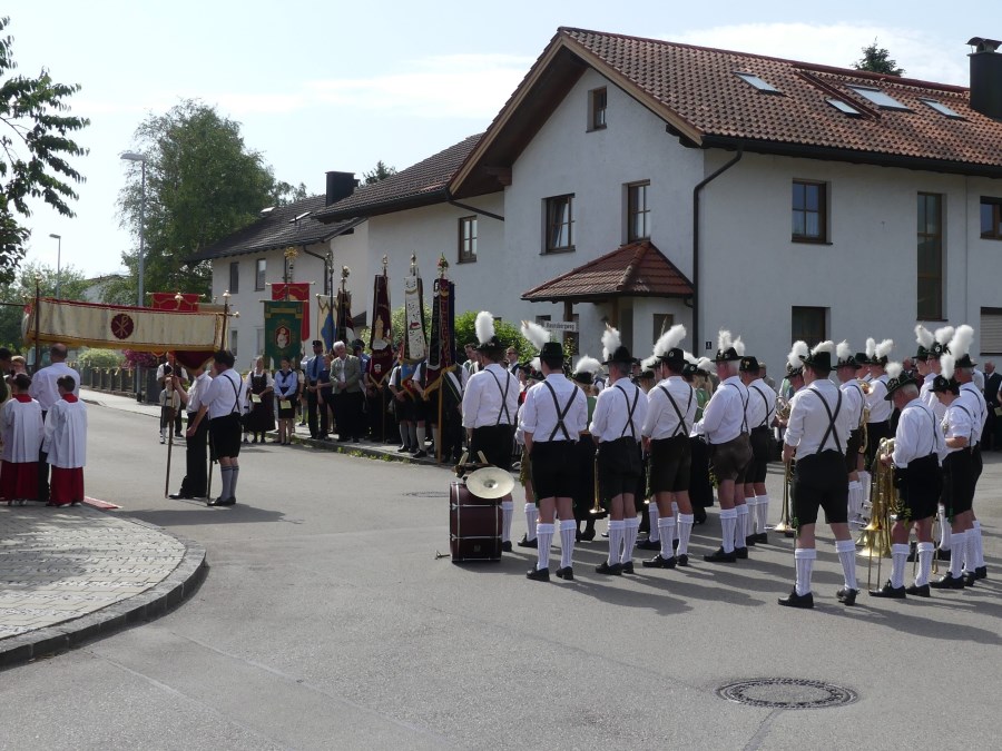 Angeführt von den Fahnenträgern mit den kirchlichen Fahnen, gefolgt von den örtlichen Vereinen mit den Fahnenabordnungen und ihren Vereinsmitgliedern und der Musikkapelle Surheim. Die Musikkapelle spielte beim Gottesdienst, bei der Prozession und bei den vier Altären.