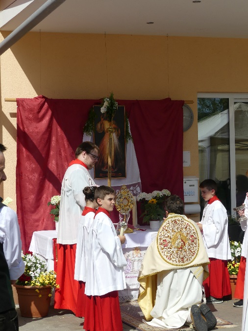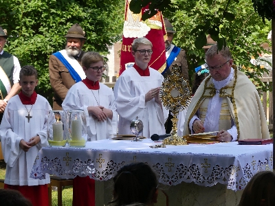 Der Vorbeter trug Fürbitten und eine Litanei vor, die von allen Teilnehmern mitgebetet wurden. An jedem der vier liebevoll geschmückten Altäre wurde ein Evangelium vorgetragen und durch Pfarrer Roman Majchar der Segen Gottes erbeten. Jeweils drei Salutschüsse umrahmten die Zeremonie.