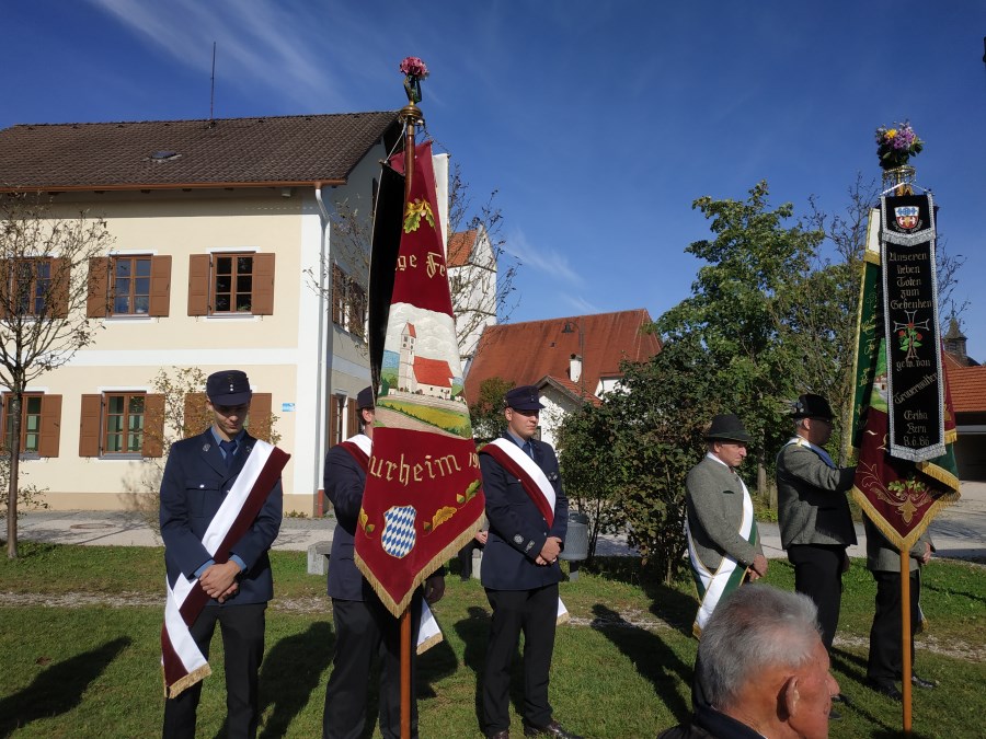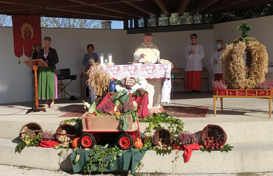 Bei schönem Wetter konnte die Pfarrei St. Stephan das Erntedankfest unter freien Himmel am Dorfplatz beim Pavillon feiern. Es hatten sich viele Gläubige und auch die Vereine mit ihren Fahnenabordnungen und eingefunden.